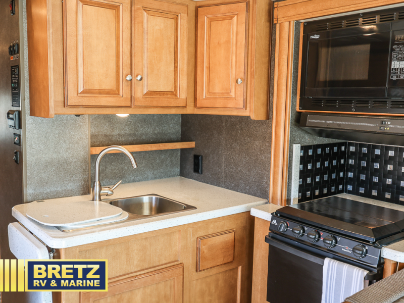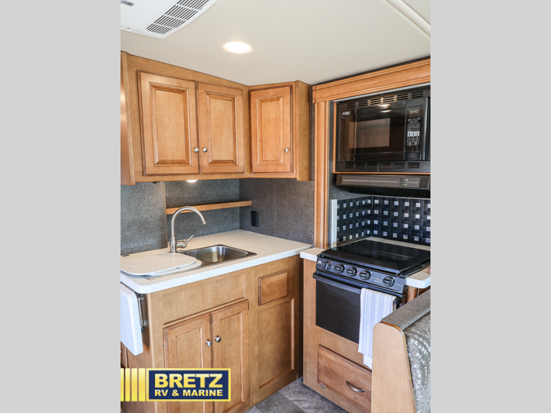 To the left of the entry door find a large wall slide featuring the kitchen appliances, and chest of drawers inside the bedroom. The L-shaped counter features a double kitchen sink, overhead storage, a three burner range, refrigerator, and a pantry.