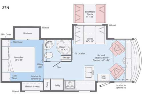 You can also choose the optional BenchMark dinette in place of the standard booth dinette, and an optional bedroom TV if you like, plus so much more!