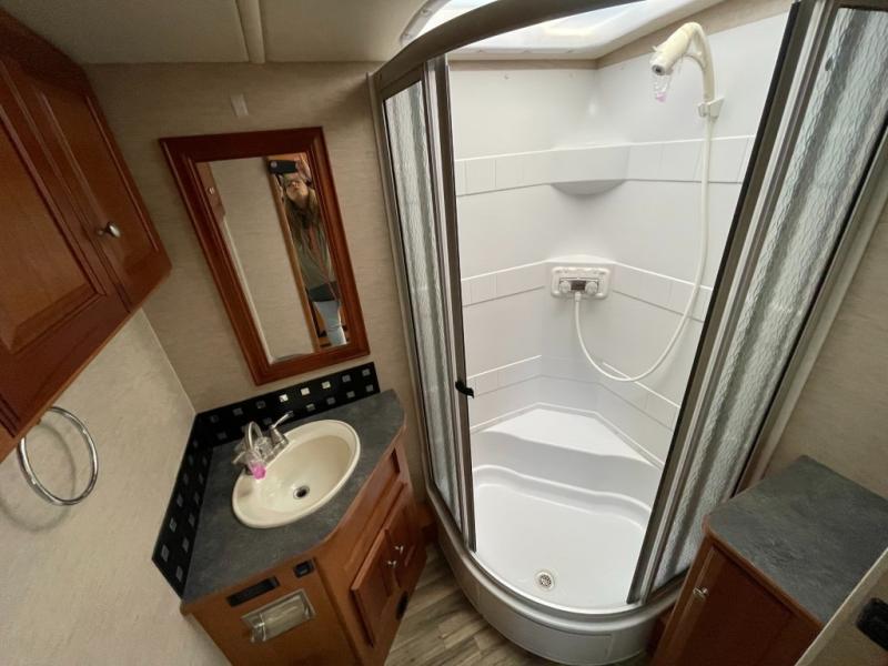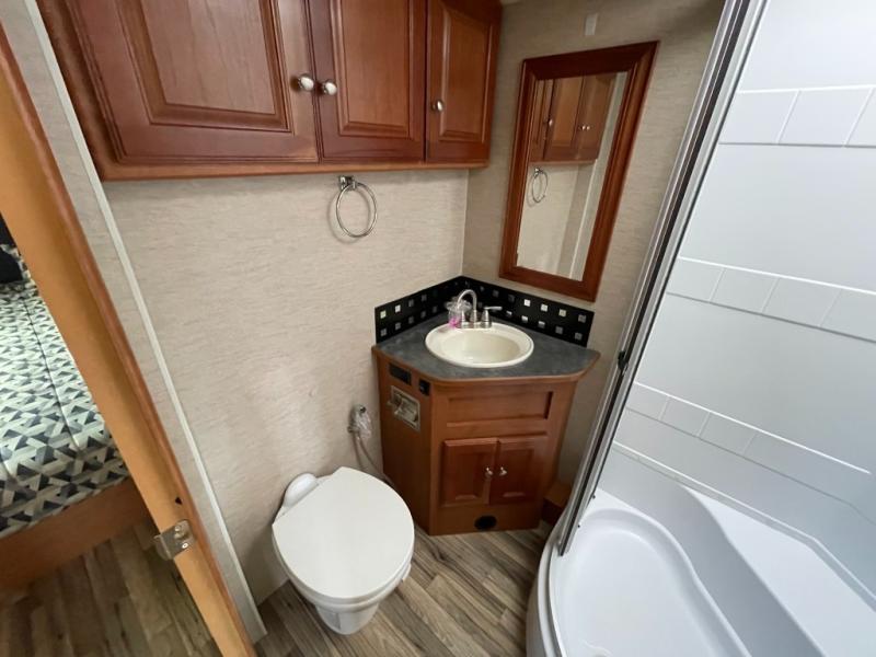 A convenient bath is located in the center of the coach and features a kidney shaped shower, corner sink, toilet, and storage cabinet.