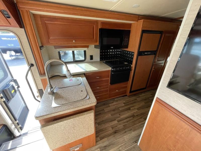 To the left of the entry door find a large wall slide featuring the kitchen appliances, and chest of drawers inside the bedroom. The L-shaped counter features a double kitchen sink, overhead storage, a three burner range, refrigerator, and a pantry.