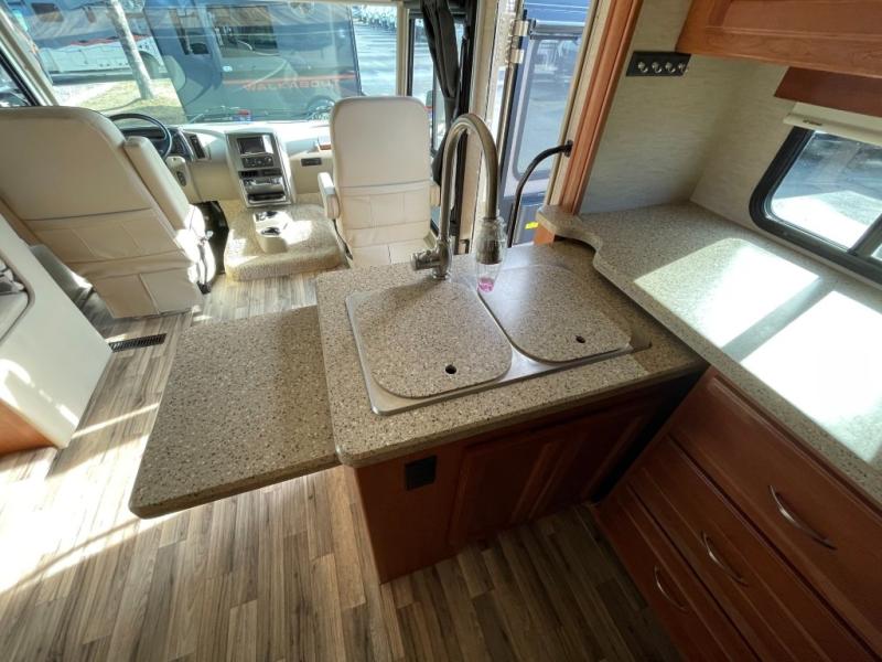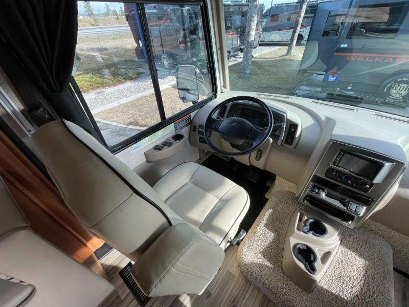This Winnebago Vista LX class A gas coach 27N features triple slide outs for added interior space, with the passenger side being almost a complete wall slide out.