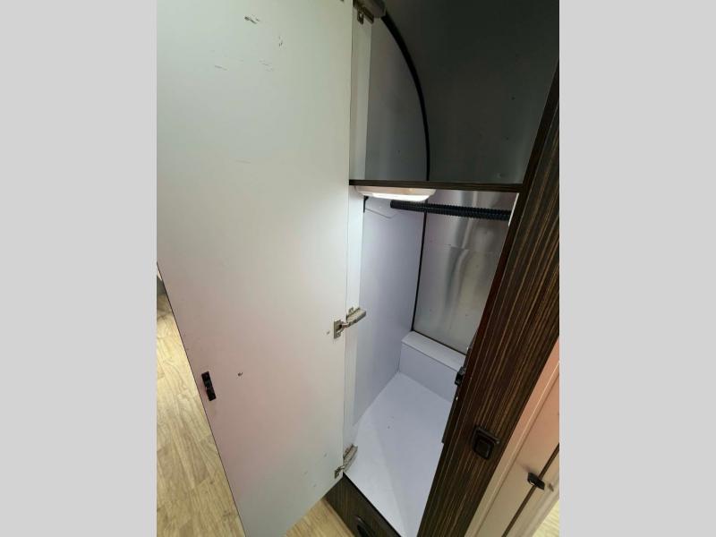 The very rear of this model provides a relaxing space for a great night's rest. Here snuggle into a queen size bed along the curb side with a nightstand up front and a wardrobe with drawers between the bed and bath. There is also an LED TV that you can watch your favorite shows or movies, plus so much more!