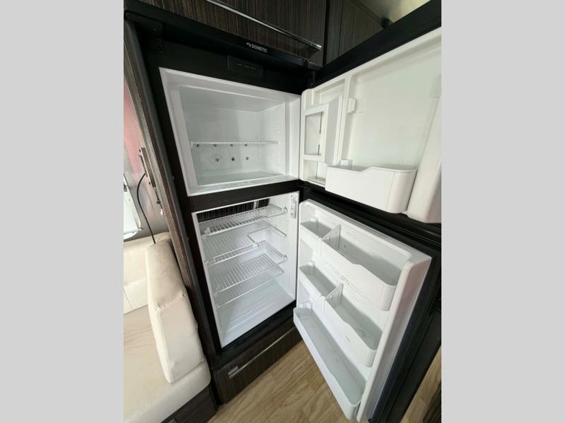 The galley is to the right of the entry door and features a round sink, a three burner range, and a pantry along the curb side of the trailer. The opposite side features a 7 cu. ft. refrigerator for your perishables. You can see how easy cooking for your family will be.