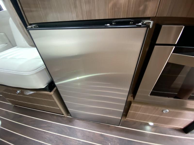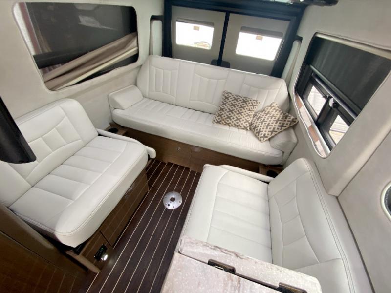 Step inside and find a convenient conversation area with the driver and passenger seats swiveled around and two additional lounge chairs, all with seat belts for safety while traveling. There is a removable table where you can enjoy your meal, or morning coffee.