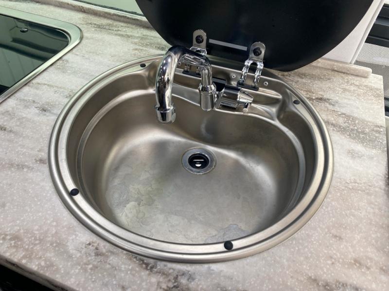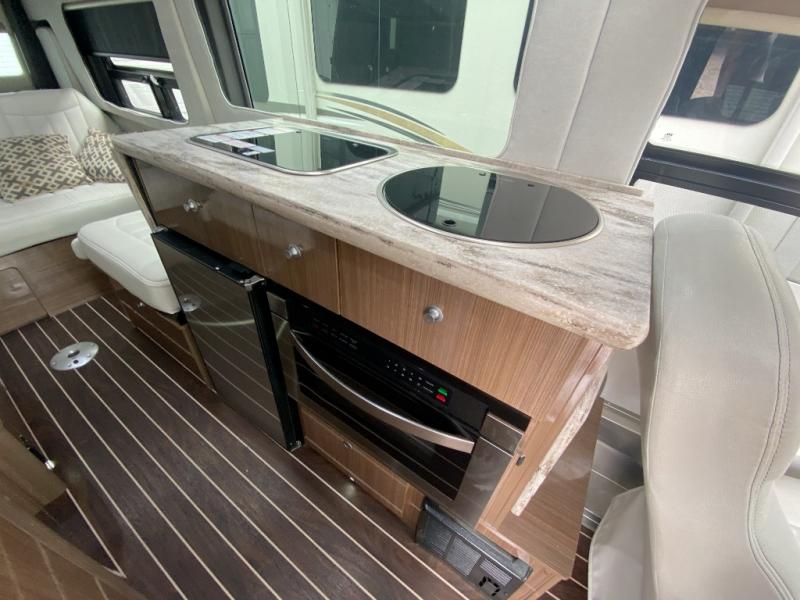 On your right side there is a round galley sink, a two burner cook-top, flip-up shelf, and overhead cabinets, plus more.