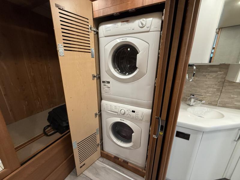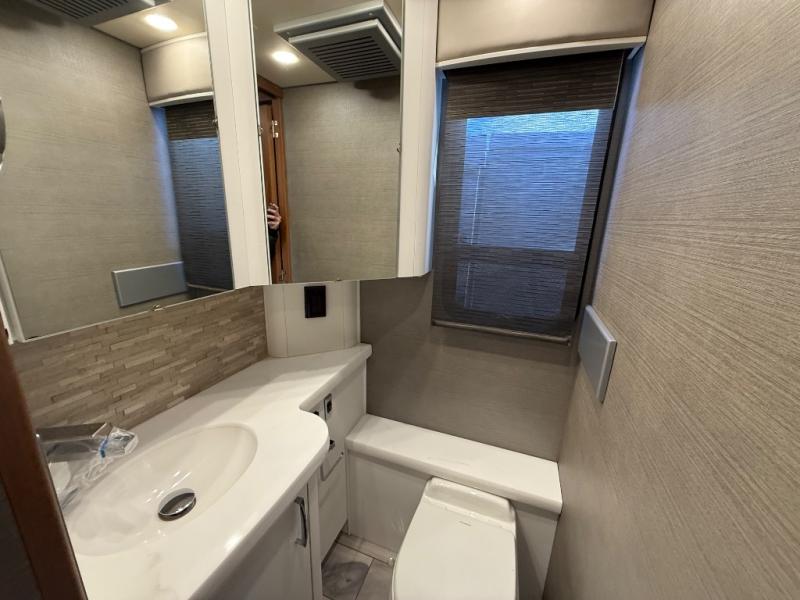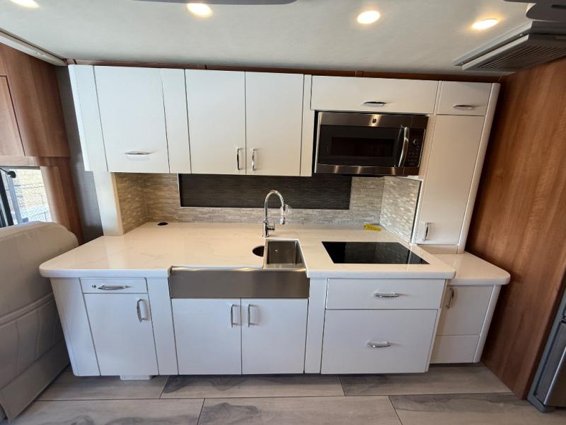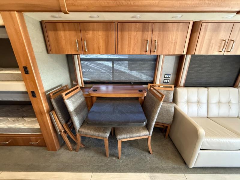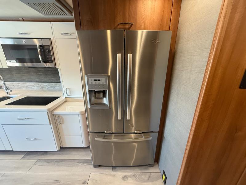 If you are looking for a motorhome with a bath and a half, and lots of space, then you have found it in this American Eagle 45T by American Coach. You have also found a motorhome that features a private bedroom with a serenity max series memory foam mattress for you to enjoy a good night's rest, a dresser with wardrobes on either side, and a 32" LED TV for those nights when you can't fall asleep. Plus, you have your own master bath that has a shower with a bench, a double vanity sink, a wardrobe, and it even has an area for the stackable washer and dryer! After you have easily whipped up your best meal in the full kitchen, you can comfortably enjoy it at the dining table and chairs. Once you've filled your belly, you can grab your favorite drink and relax at either 82" ultraleather sofa with an air mattress or the 60" ultraleather sofa while watching your favorite movie on the 48" LED TV!