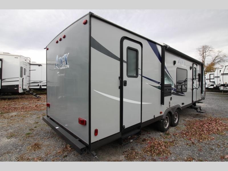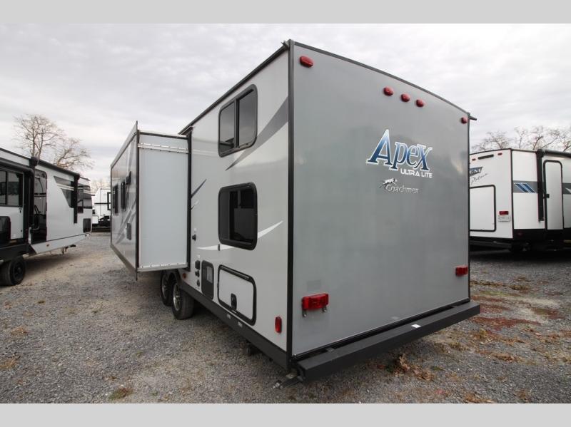 The Coachmen Apex Ultra-Lite model is a quality lightweight trailer that is eco-friendly with innovation throughout. Each model is built with vacuum bonded Azdel fiberglass sidewalls on a I-beam chassis construction. The inside includes stainless steel appliances, a stonecast double bowl kitchen sink, energy efficient LED interior lighting, hardwood mortise and tenon cabinet door frames, and Ambrosia Ash cabinetry throughout. It's time to find the perfect model for you, and start enjoying each adventure!