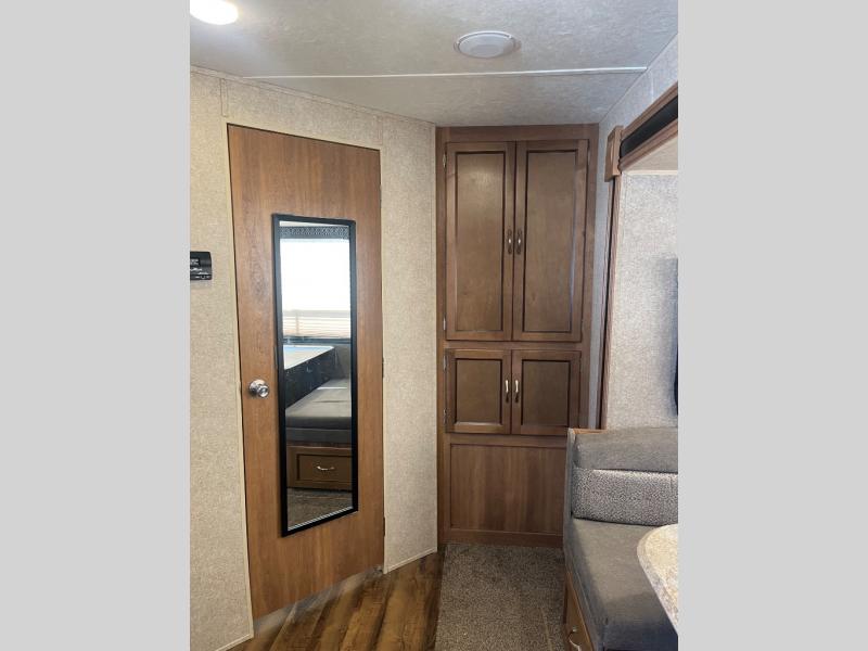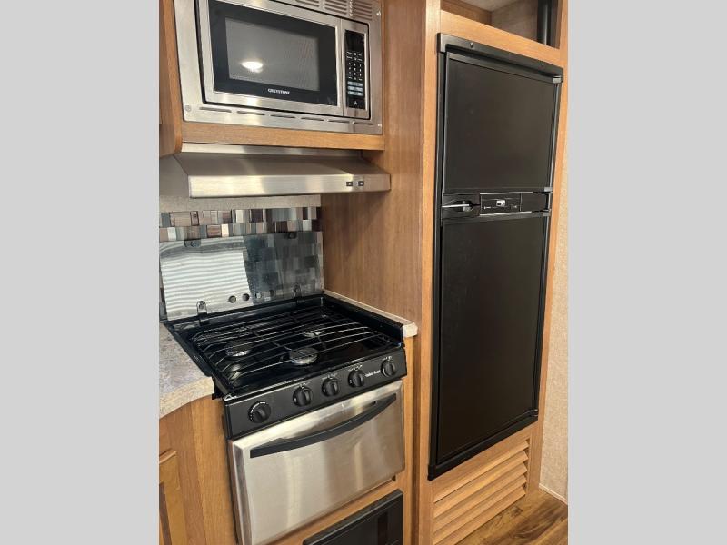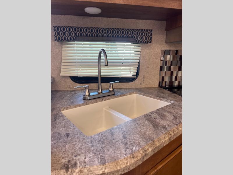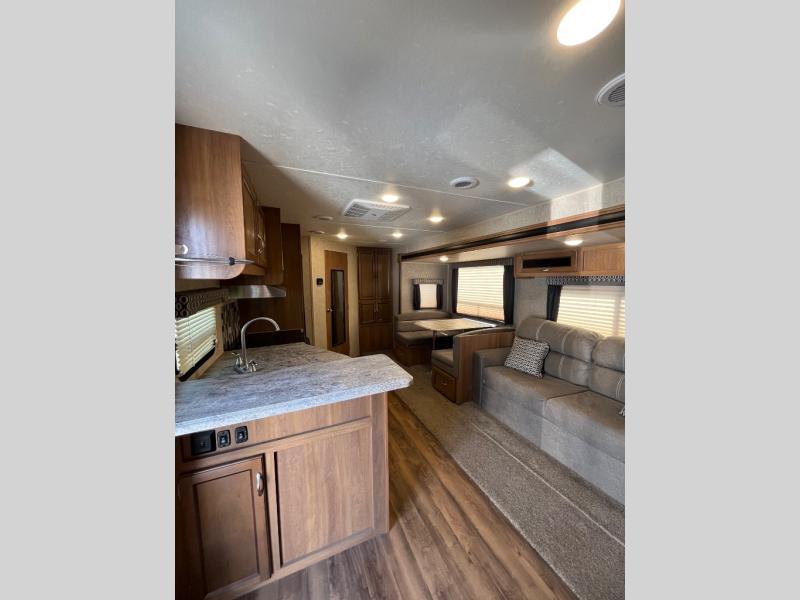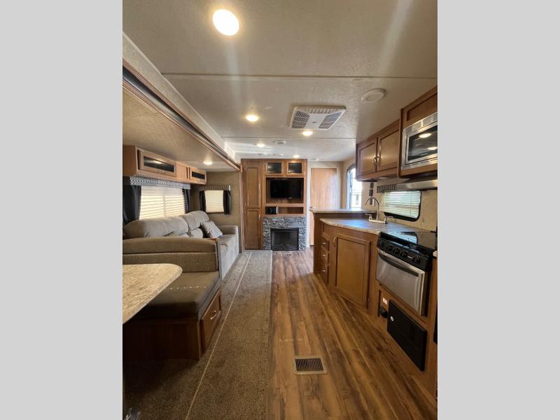 As you move into the main living area of this unit you will see a spacious retreat filled with everything you need while traveling away from home. The single slide out featuring a 45" booth dinette and 70" sofa provides plenty of space for dining and just hanging out. There is a pantry and an entertainment center located nearby on the interior living room wall that can easily be seen from any of the seating. It also includes a cozy fireplace below.
