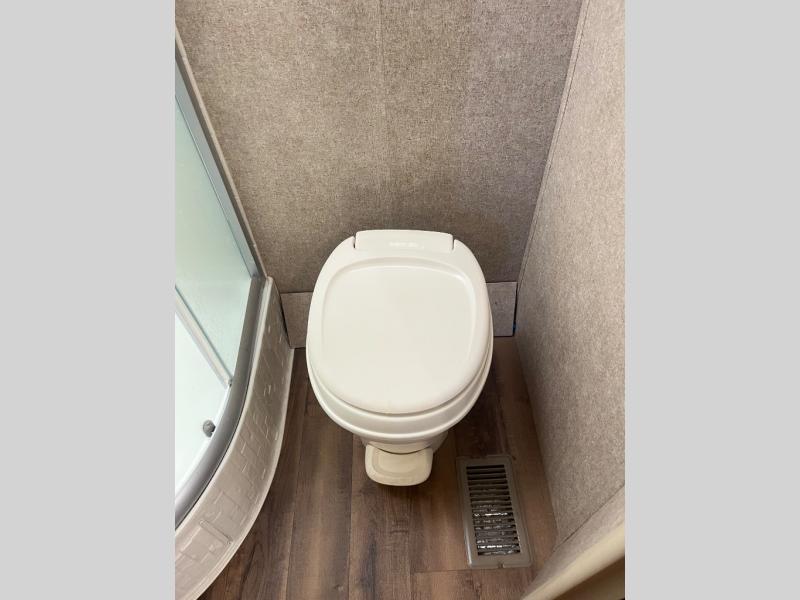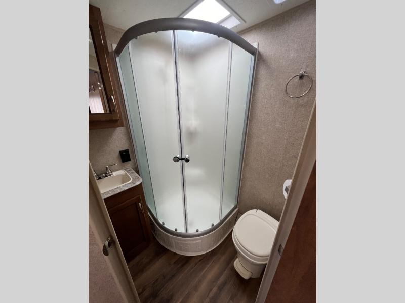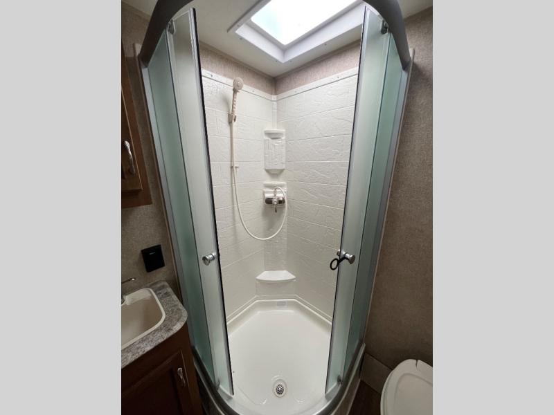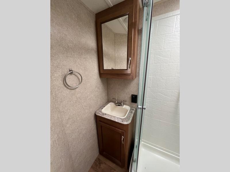 The rear of the travel trailer features a second pantry and wardrobe, plus a corner bath complete with an angled shower with glass door, toilet, and a sink with medicine cabinet above for your convenience.