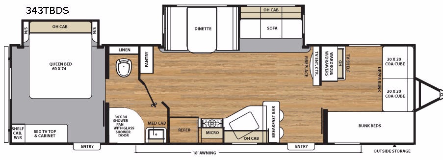 On the outside you will find an 18' awning that allows you to enjoy some protected space outdoors from the wind, sun, and rain. There is also outside storage in front where you can tuck away some of your outdoor gear when not in use. This model also makes available the option of adding a queen bed up front in place of the bunkhouse if you don't need as much sleeping space. The choice is totally up to you!