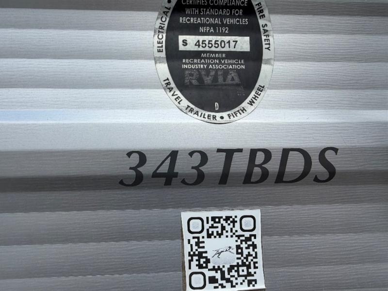 Step inside model 343TBDS using the door closest to the front, and notice a breakfast bar with two stools to your immediate left. There is a large sink around the corner, and a three burner range with overhead microwave that will make cooking while you camp super easy. There is also a refrigerator along this same curbside wall, and opposite you will find a pantry for dry and canned goods as well.