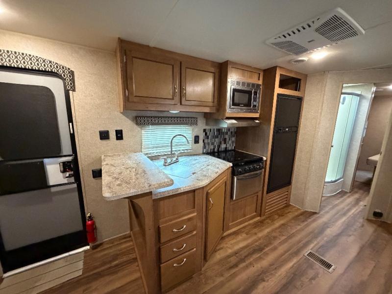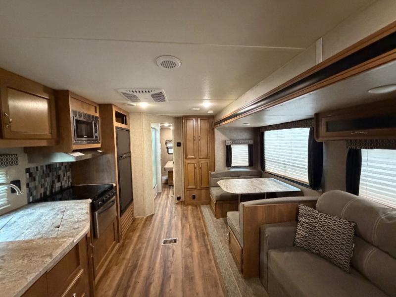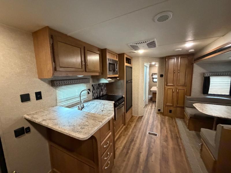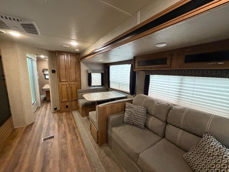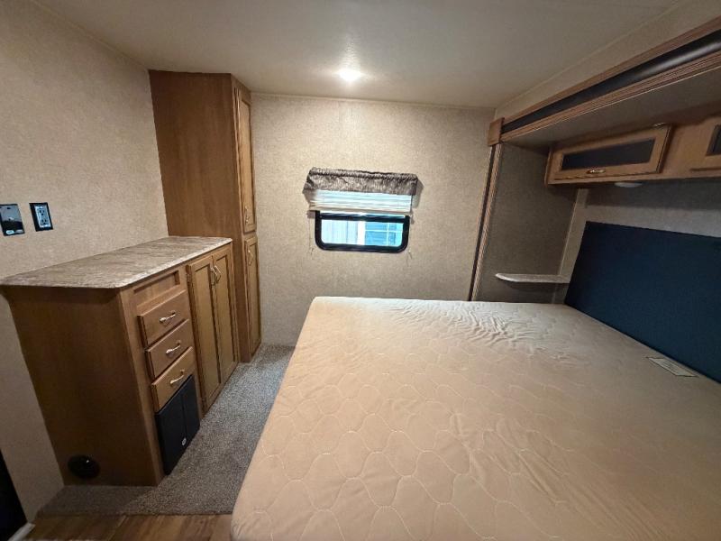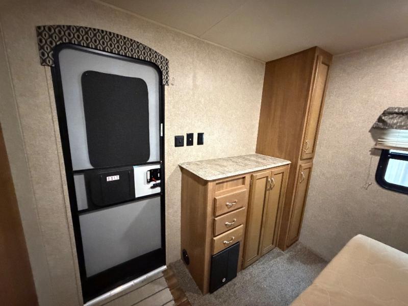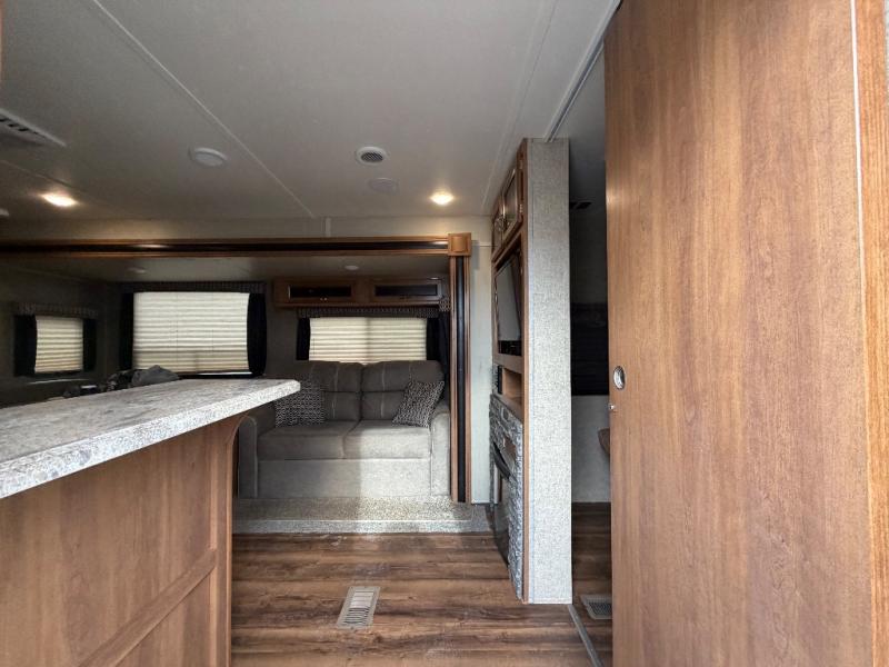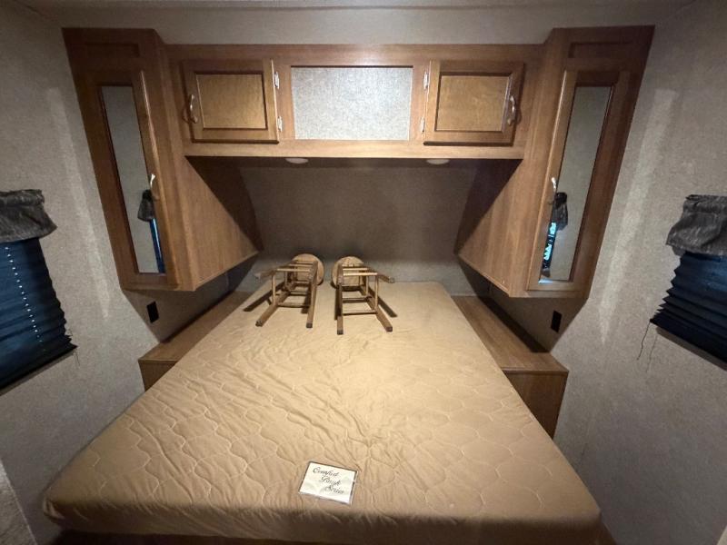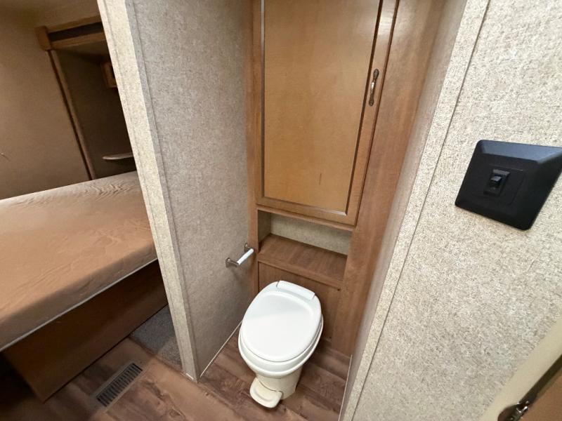 At the very front of this Catalina Legacy model you will find a bunkhouse that the kids are sure to love. It features a sliding door for privacy and includes a set of bunks along the curb side, and a second bunk above two 30" x 30" COA Cubes below along the outer most front wall. There is a wardrobe for clothing to your left when you enter along with a TV shelf including overhead storage for your things.