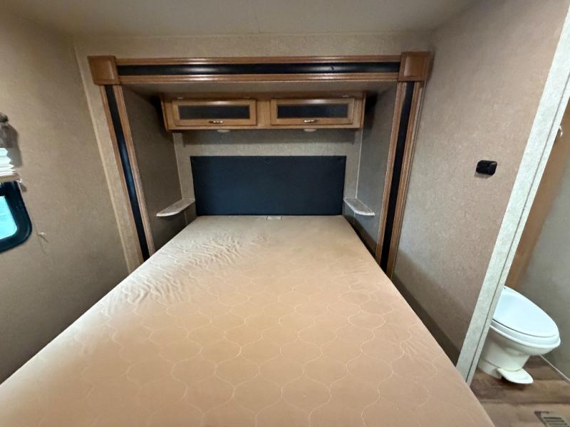 A sliding door leads into the master bedroom from inside the bathroom. There is also a second entry door from outside that leads into this rear bedroom as well. Here you will find a queen bed slide out with nightstands on both sides, plus overhead storage above, and a cabinet with TV top opposite just to the left of the door.