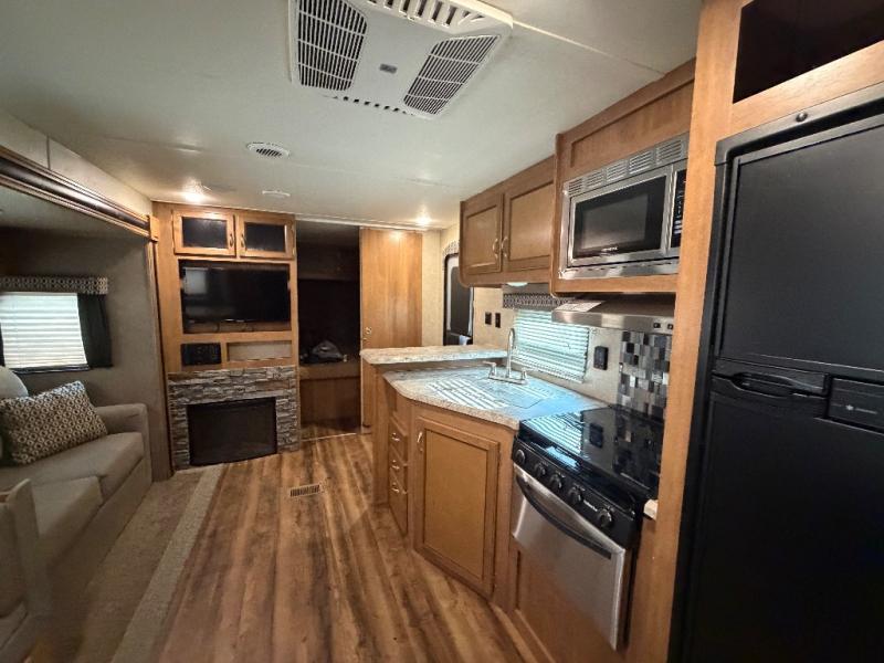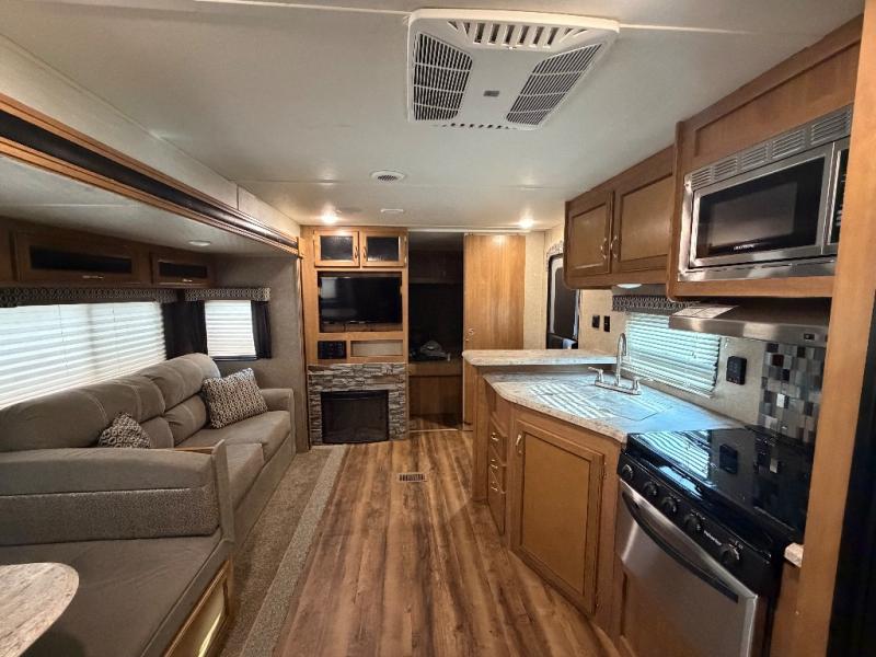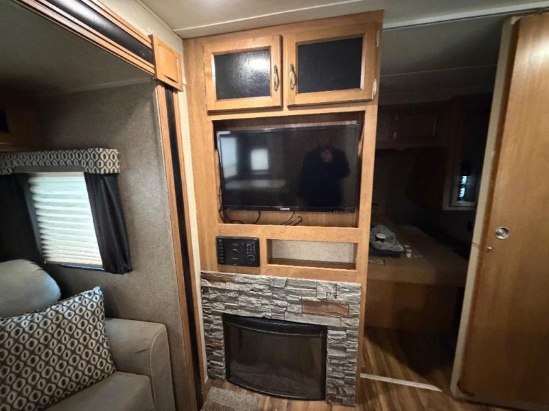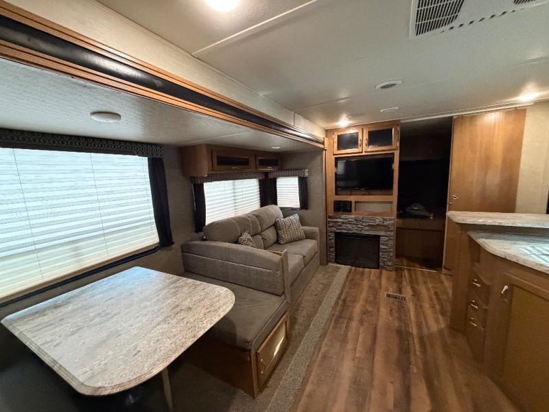 The slide out opposite the main entry door features a booth dinette and a sofa. You can opt. for a free standing dinette if you like, plus there is overhead cabinet space above the sofa for your things. Adjacent you will find an entertainment center with a fireplace below. The fireplace is a great feature when you camp in cooler weather, and it brings a warm ambiance to a relaxing evening indoors.