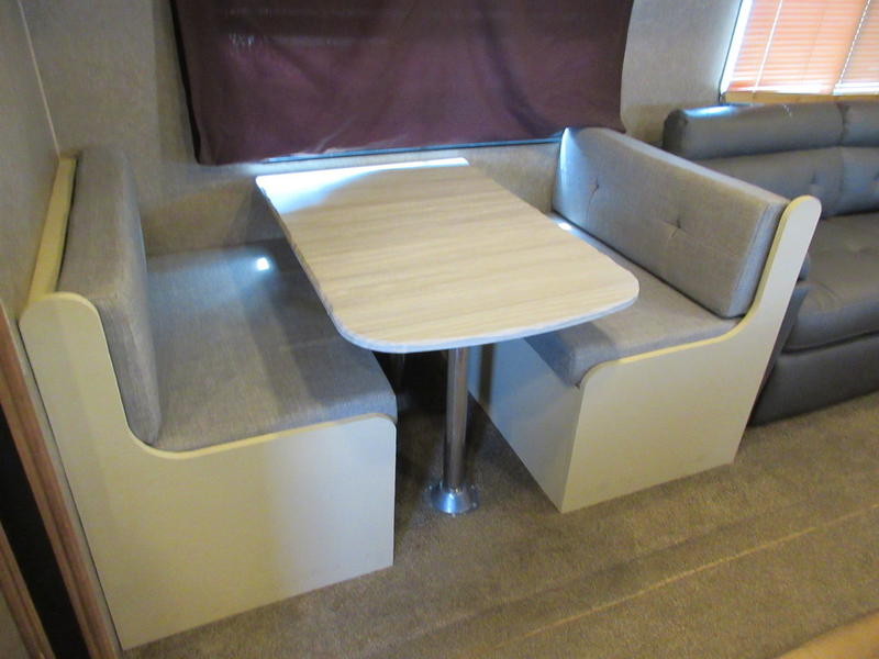 Step inside the entry door furthest to the front. This takes you into the combined kitchen and living area where you will enjoy added floor space thanks to a large slide out u-shaped dinette and sofa along the road side wall. There is storage above the sofa, and a nearby TV entertainment center that can easily be viewed from any seating here.