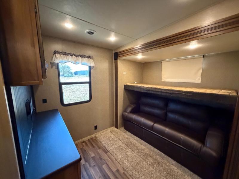 This Chaparral bunkhouse fifth wheel by Coachmen RV has space and facilities to accommodate your whole gang! Model 373MBRB features two private bedrooms with one including double slide out bunks that are 48" x 64", which are perfect for your little ones. This unit also features double entry doors with the rear most door leading into a second complete bath. Now that is convenient! And, when you are not out enjoying fun outdoor activities the interior, with its FIVE slides, will keep everyone happy in their own space. There is plenty of seating throughout with a tri-fold slide out sofa, theater seating for two in the combined kitchen and living area, plus a free standing dinette for four which is a great place to enjoy a game, puzzles, and of course a meal or snack. The kids will certainly enjoy a little private space in the middle bunk room, as well as mom and dad having their own private retreat up in front including their very own en-suite bath!