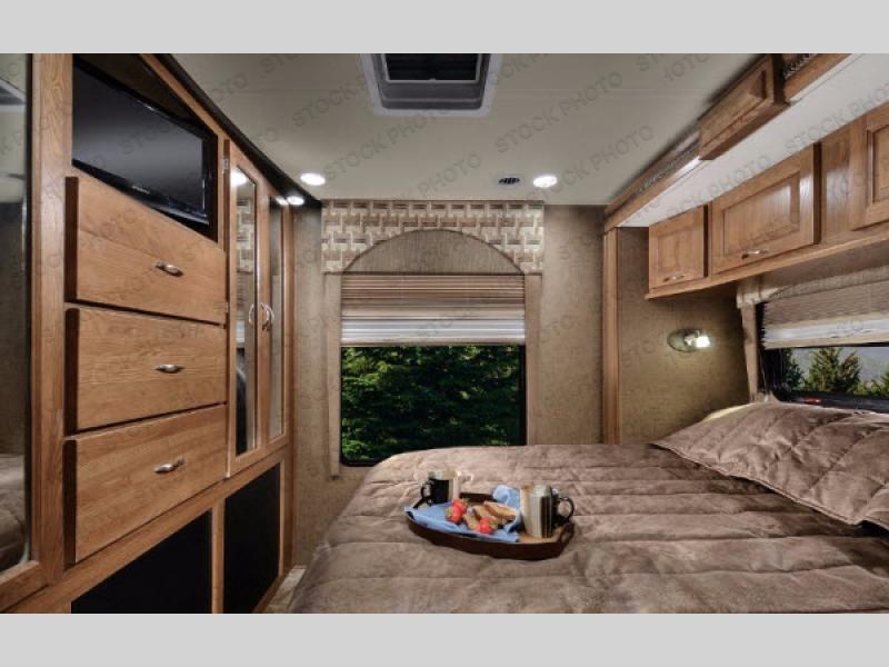 Head into the rear bedroom where you can rest up for another day of adventure easily. There is a slide out queen size bed with nightstand and storage along the road side, along with overhead cabinets for your things. There is also a dresser opposite for clothing storage, and a space for an optional 24" TV if you choose to add.