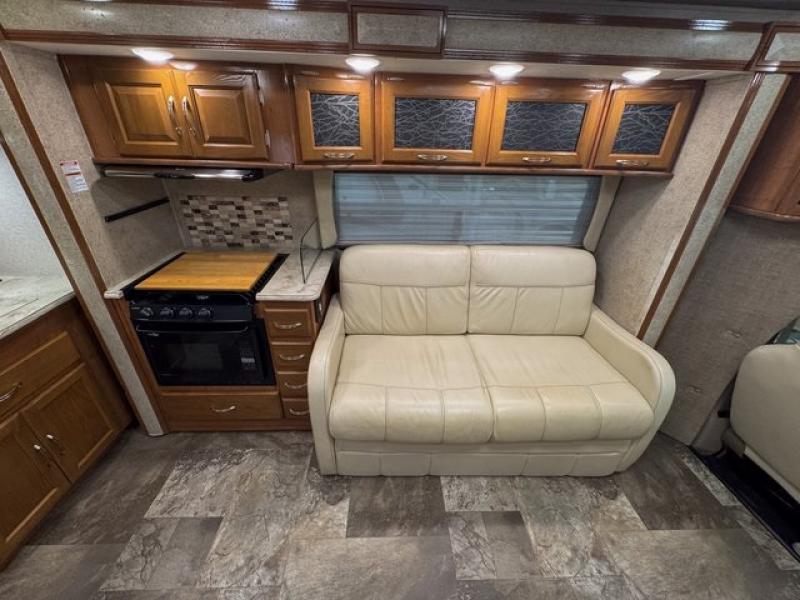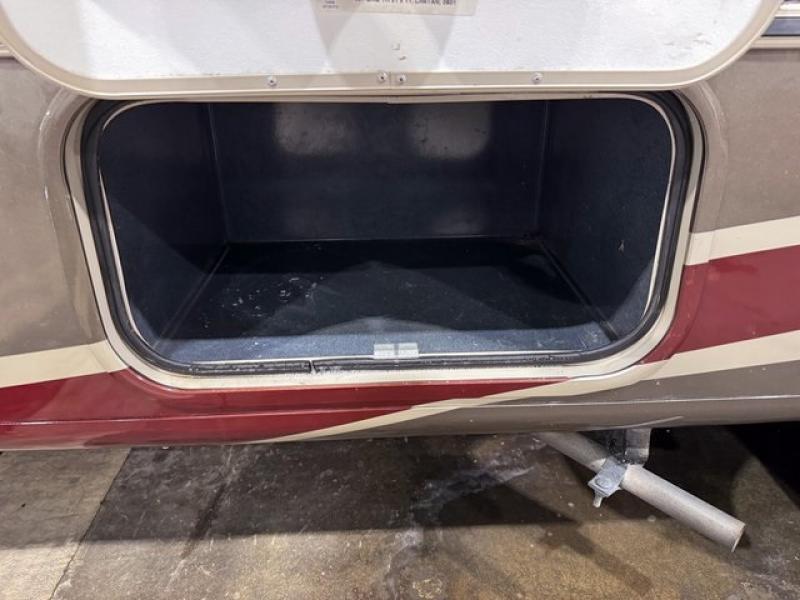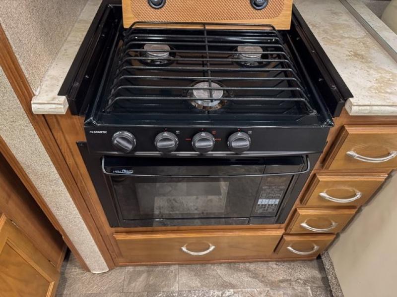 Step inside and find a wide open interior with dual opposing slides fully extended. There is a booth dinette slide to your immediate right as you enter. Enjoy the entertainment center with 32" TV found above the cab area when relaxing inside. The second slide out, opposite the door, features a comfortable sofa with overhead storage, and a three burner range for cooking meals at.