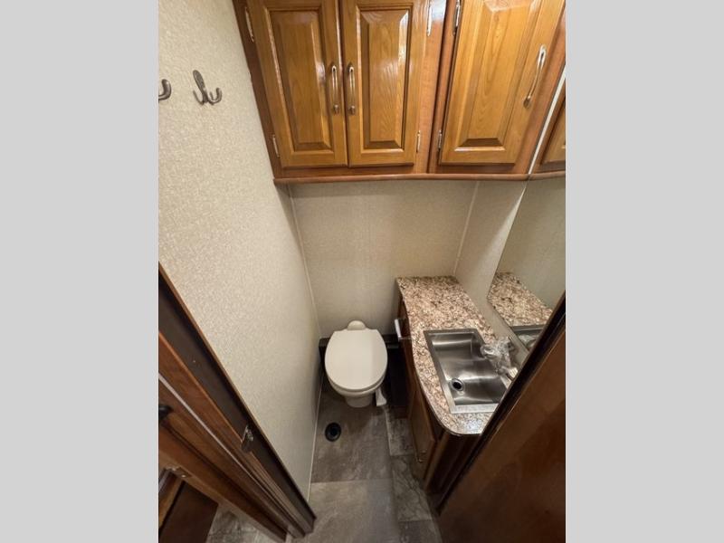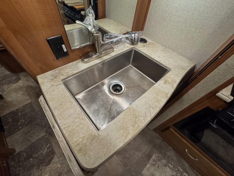 Just off the sofa and range slide out there is a counter space with a round single sink for cleaning up, overhead cabinets for your dishes, and a countertop extension if needed. The refrigerator is located across the aisle along the curb side wall near the entry door.