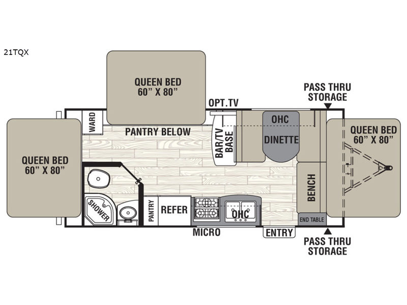 It will be easy to keep clean and refreshed while away from home with a full on-board bath that includes a radius shower, a toilet, and a sink with medicine cabinet for storage. In the rear right corner between the side and rear queen expandable beds you will find a wardrobe, plus additional storage in the pantry below the side queen bed. There is a nearby bar/TV base next to the dinette. You can add an optional TV here if you choose.
