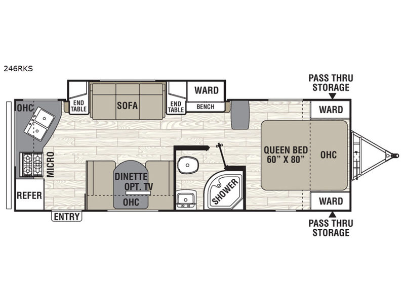 The large roadside slide opens up the living space and features a comfortable sofa with two end tables and also a wardrobe with bench seat. Opposite the slide you will find a booth dinette that also has overhead storage available.. You can choose to add an optional TV here as well.