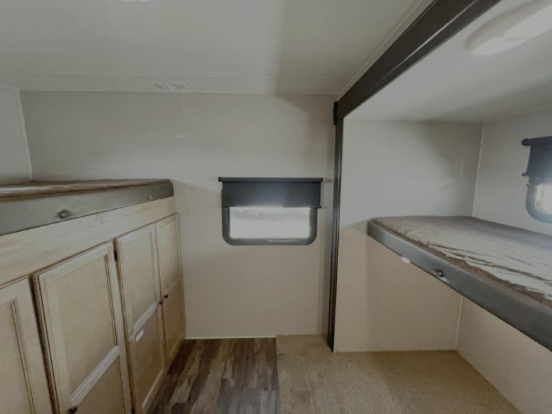 The private rear bunkhouse is perfect for the kids and extra guests to feel like they have a little space to call their own. There is a 42" x 74" bunk on the left with wardrobe and ladder beneath, and a slide out futon opposite with flip-up bunk above.