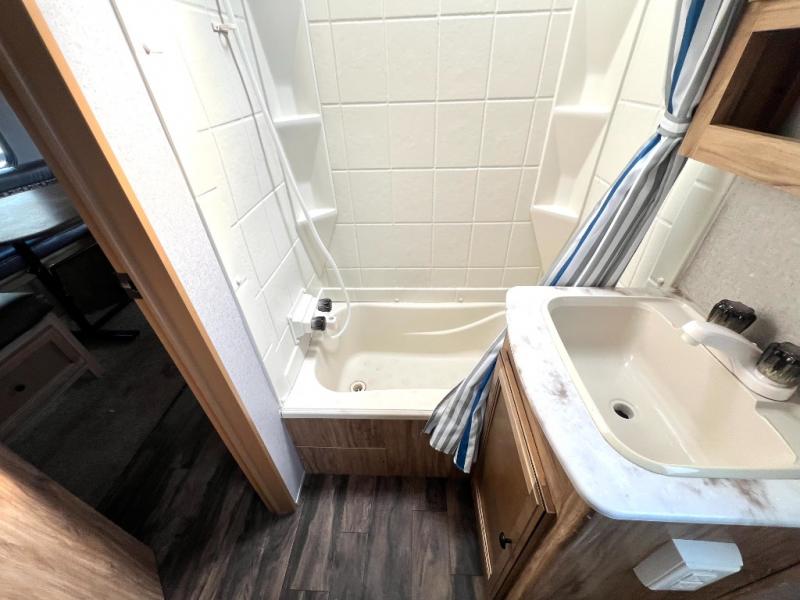 Step further back into this Freedom Express trailer and find a convenient full bath with a toilet, sink, and tub/shower, or enter the rear most side exterior door which provides immediate accessed from the outside. No more running through the entire trailer for the bathroom when outdoors.