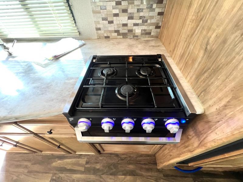 The kitchen is along the curbside and features all of the amenities needed to provide meals and snacks for your whole crew. There is a pantry for your dry and canned goods, a refrigerator and microwave oven, plus a three burner range for cooking. You will also find a double sink which makes cleaning up a cinch.