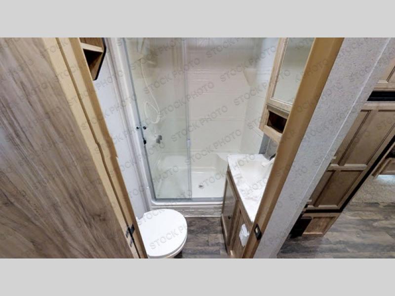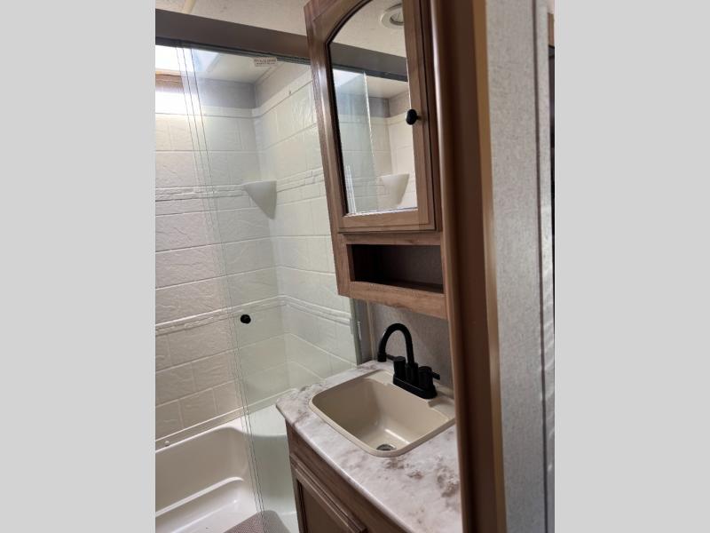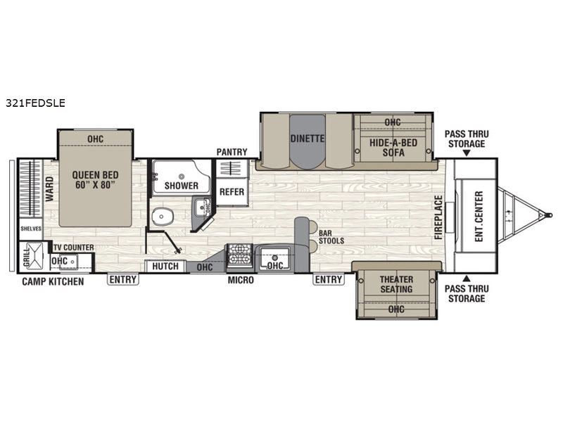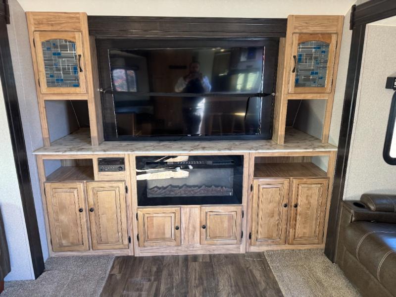 Inside, the living area is built for connection. Dual slide outs create open space for seating, including theater chairs and bar stools around the kitchen island. A front entertainment center with a fireplace offers cozy nights in and keeps the group entertained no matter the weather. The rear private bedroom provides a comfortable retreat with storage and a restful queen bed. A full bath ensures convenience and privacy for everyone on board.