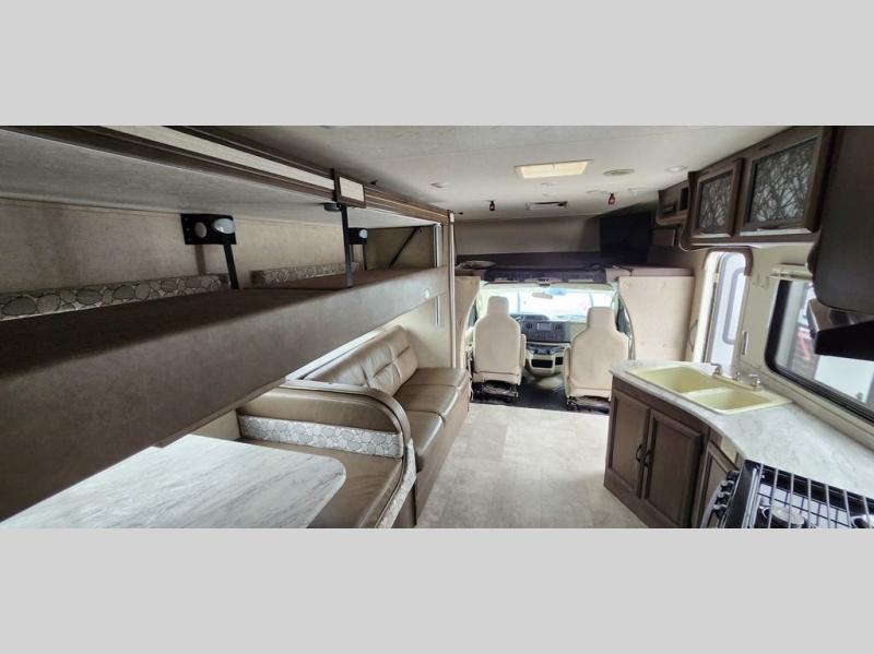 This Freelander Class C gas motorhome is more than just an RV: it is a luxurious house on wheels. With enough room to sleep seven people because of the queen-size bed and bunk over the cab, this motorhome provides a spacious area for your family to spend their next getaway. Because there have been two slides included in the layout of this unit, you can move about freely in the fully-stocked kitchen while you cook up a delicious meal on the 3-burner range top.