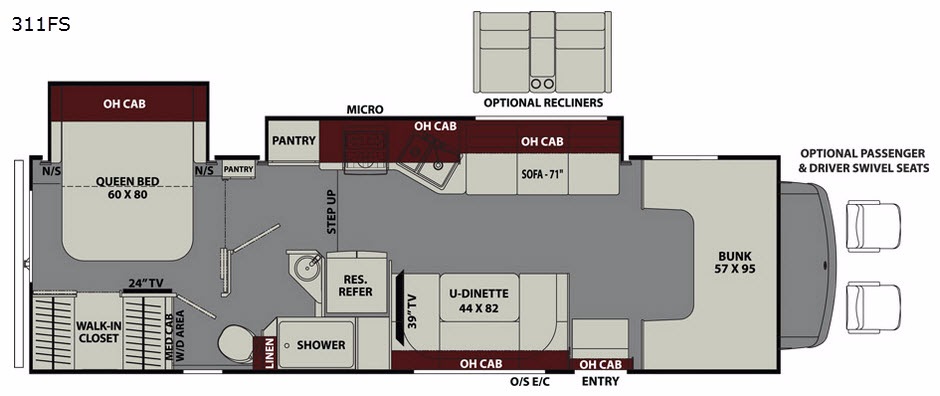 Modle 311FS is the perfect model if you are wanting a little more luxury while you are away from home. The bedroom has a walk-in closet for all of your things, and you can actually hang your clothes up! There is even a private entry door into the bathroom for convenience at night. The slide outs throughout the unit give you plenty of extra space while you are parked and enjoying your vacation. Feel free to bring along up to six extra people if you are a just a couple, or if you are a family of up to eight then you will sleep comfortably.