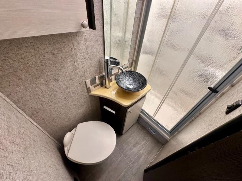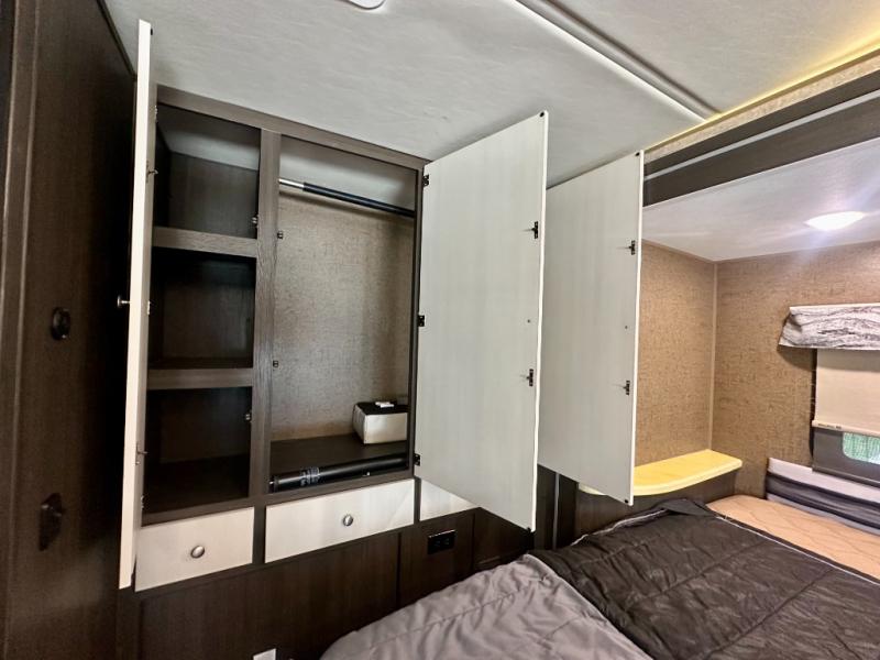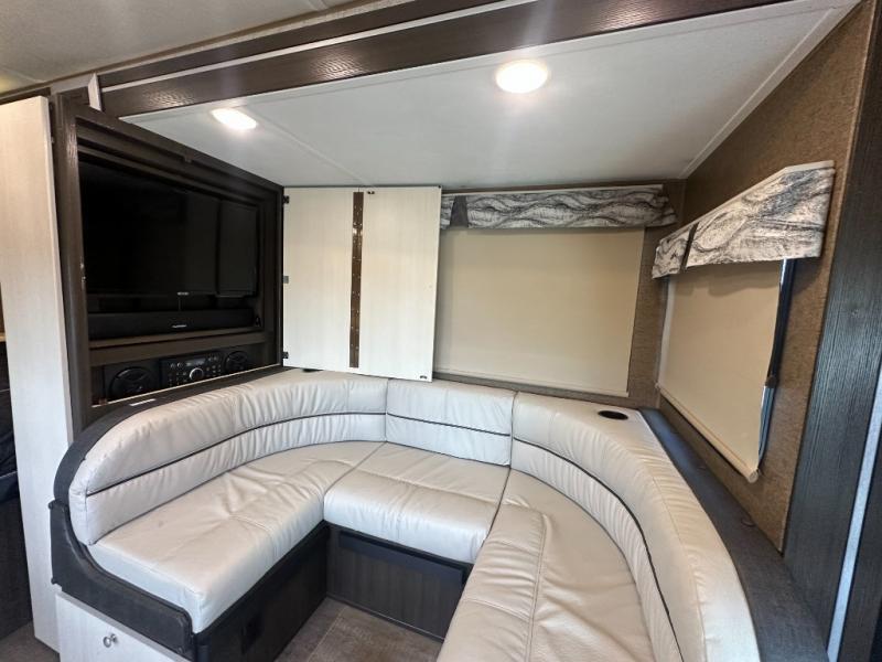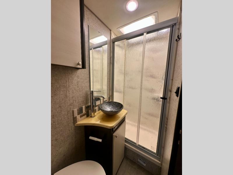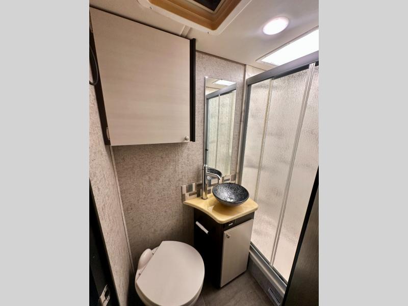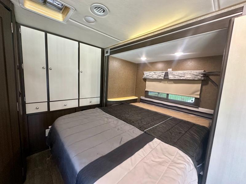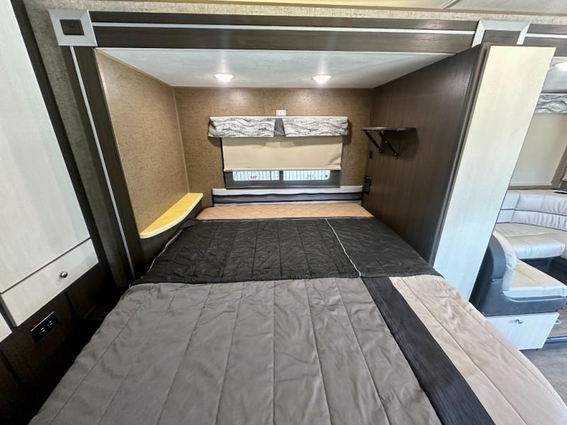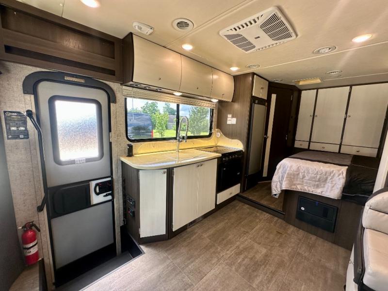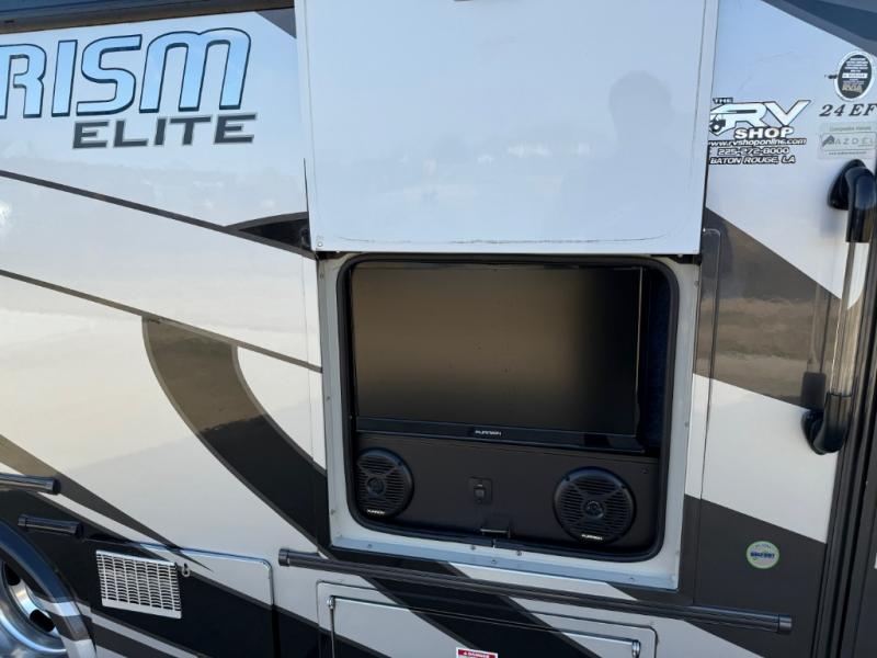 Do you dream about traveling to far destinations and enjoy attending events with the comforts of your own bathroom and bedding? This Prism Elite 24EF class C diesel motor home makes traveling and sleeping comfortable for all. In the morning you can enjoy your coffee while sitting in the driver and passenger seat with a pedestal table between. You can rest on the queen bed while the kids or your guests sleep on the cab-over bunk or U-shaped dinette once prepared for bedtime. You will appreciate the convenience of a private bathroom no matter where you travel. And the cook will surely love heating up leftovers in the convection microwave for quick meals when on the go. Come see why this RV just makes sense!