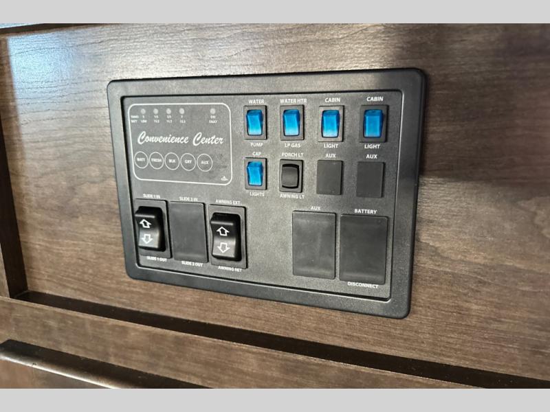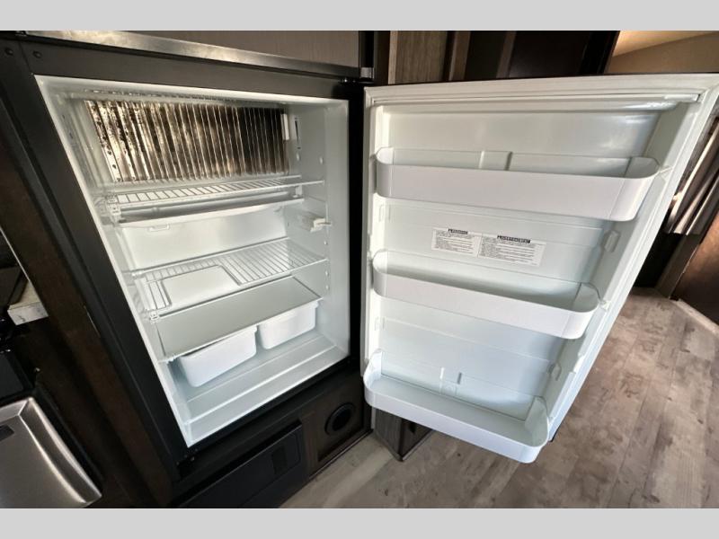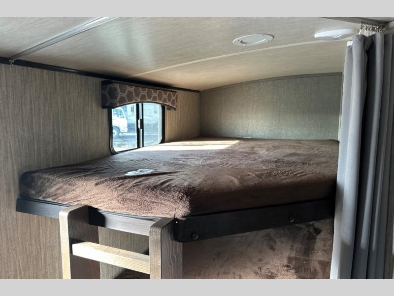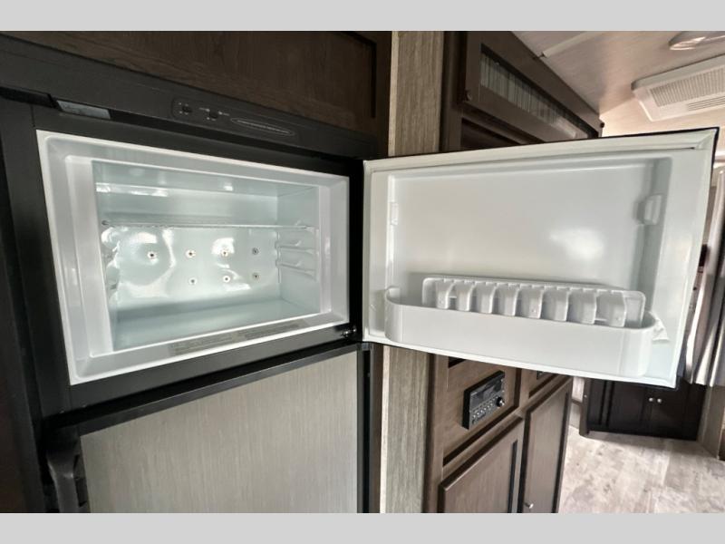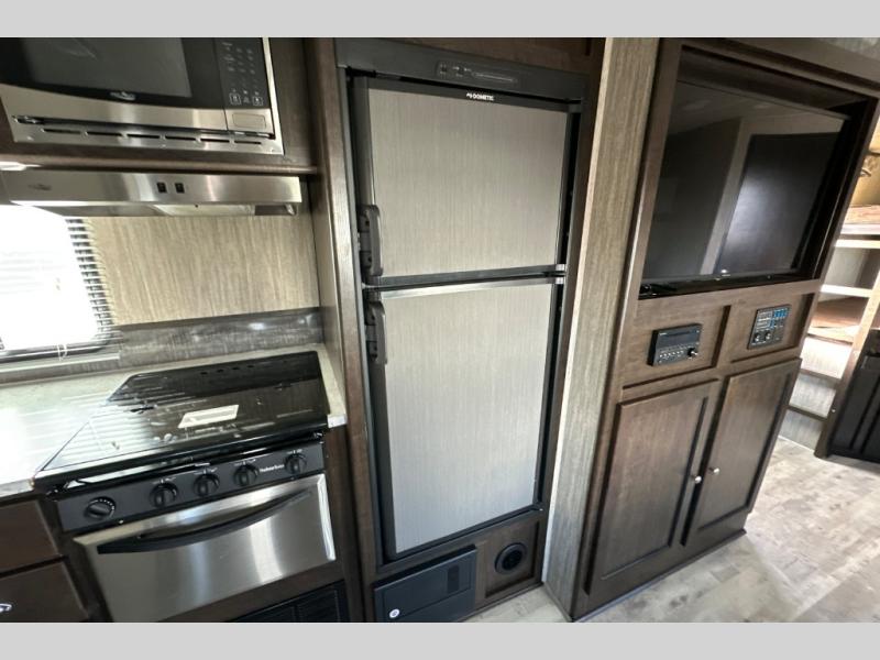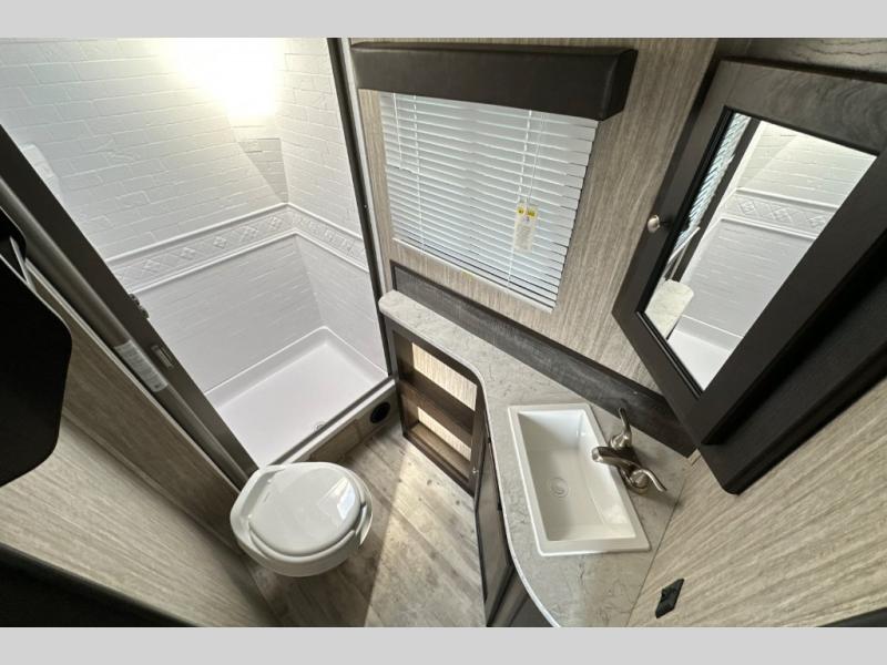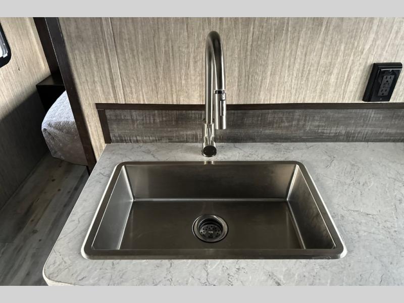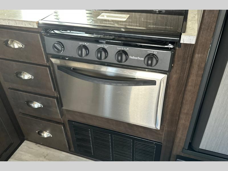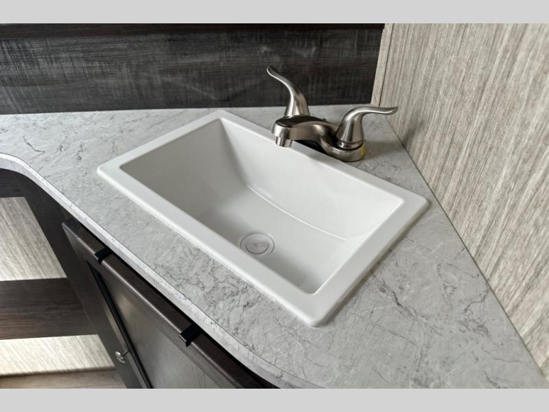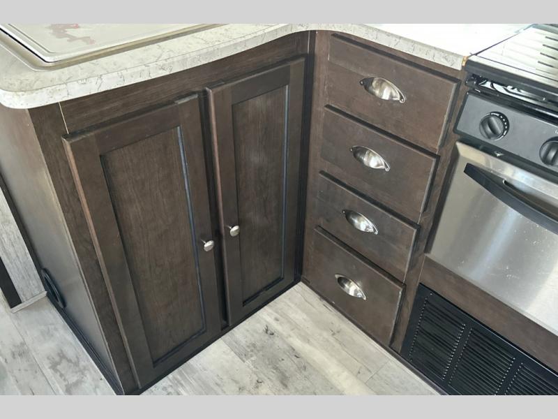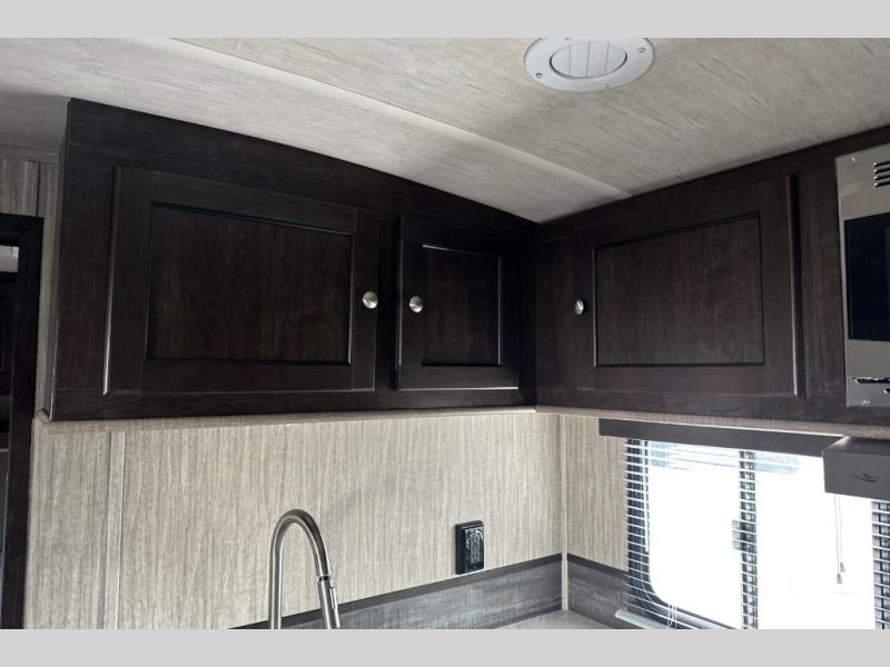 Because this Cruiser RV trailer has been built with aerodynamic and light-weight construction, you can pull this unit with a half-ton truck, giving it a better fuel efficiency rating all around, and the Flex Foil insulation that has been installed in the frame cavity allows you to take this trailer for extended season camping because it can withstand colder climates. This trailer may be light in its construction, but it is packed full of helpful amenities, such as the hidden storage cabinets that allow this unit to utilize all available space to the fullest, and the oversized exterior pass-through storage with LED lighting lets you bring along all of the camping gear you may need.