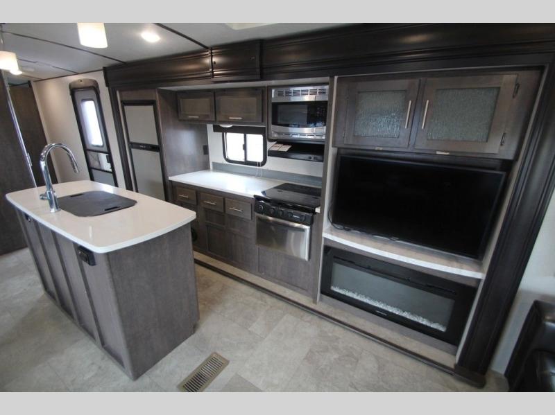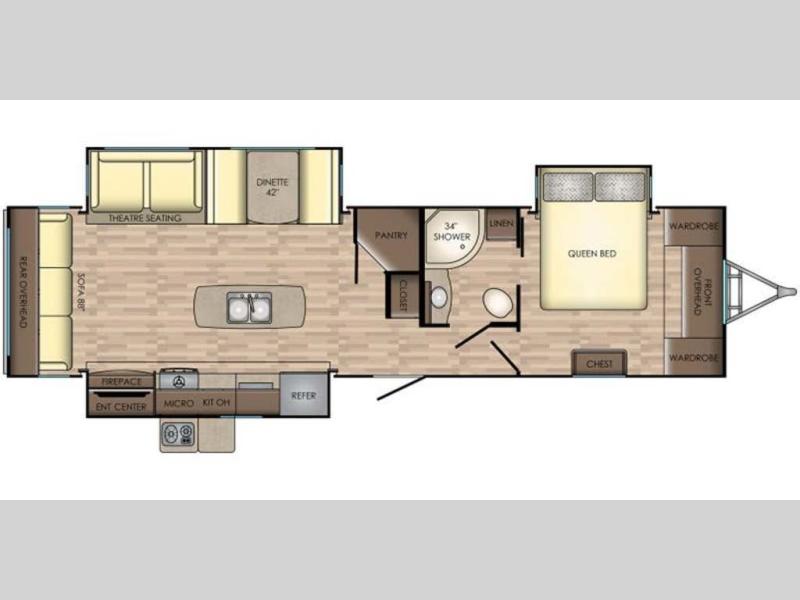 For a little rest and relaxation from the busyness of life you will want to camp with this triple slide out Sunset Trail Grand Reserve SS33SI travel trailer. Meal prep can be done either inside or outside. When you choose to use the inside kitchen you will find that it is is fully equipped with a three burner range, an island with a double sink, plus there is a large pantry. The outside kitchen features a pull out cook top. You will enjoy all of the storage space throughout from the overhead cabinets to the bedroom wardrobes and chest of drawers!