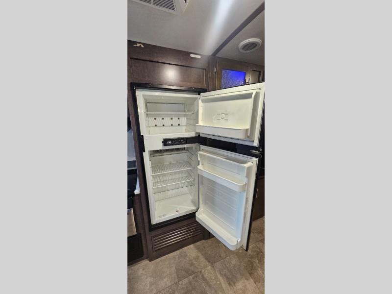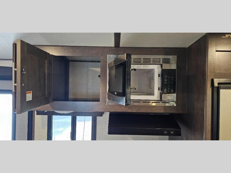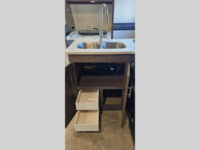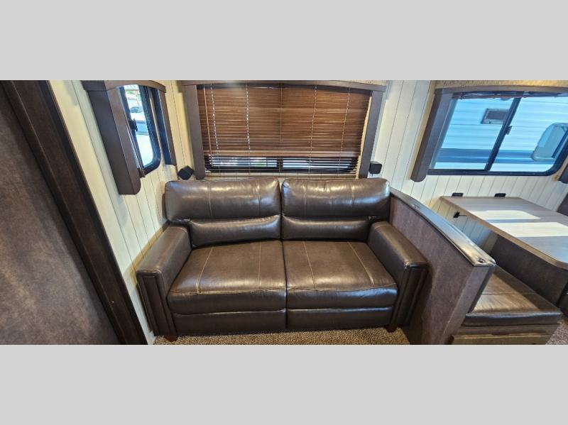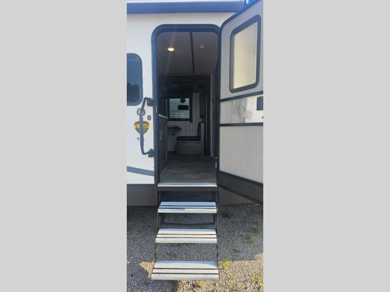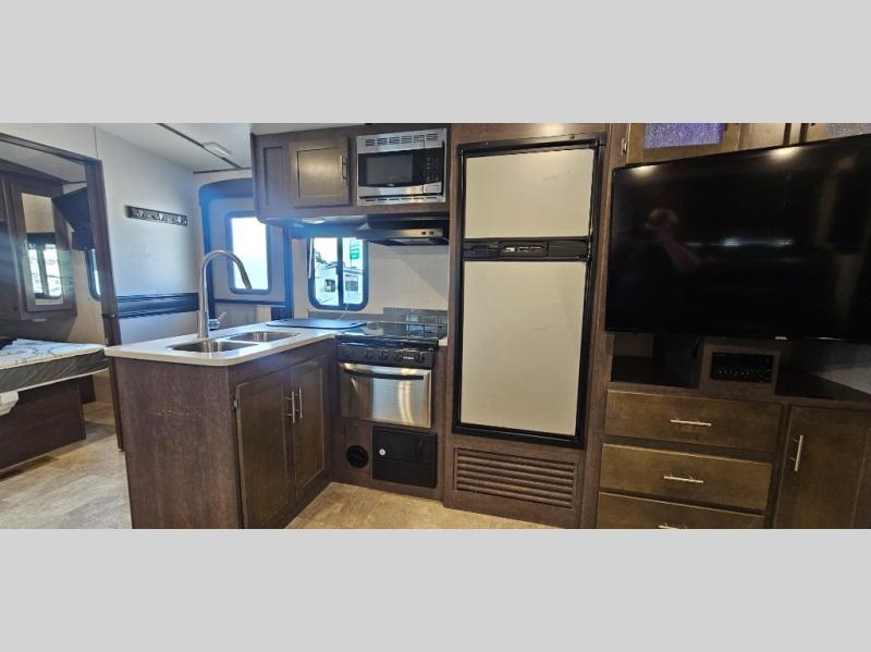 The exterior of this CrossRoads travel trailer is completely sleek and modern looking with its tinted windows that help protect your interior decor from fading and its painted fiberglass front cap that curves over to the roof giving this model a more aerodynamic approach. However, you will enjoy spending your evenings outside of this trailer for more reasons than just the appealing exterior vibe because this model comes equipped with an electric awning with LED lights, as well as outdoor speakers which make this area the perfect place to host a late-night get together with friends.