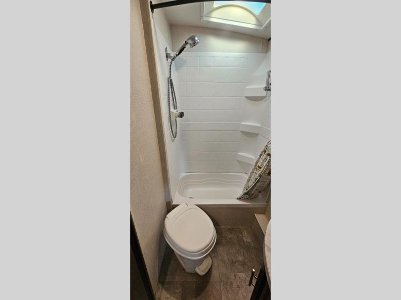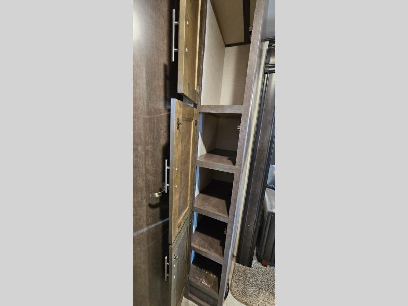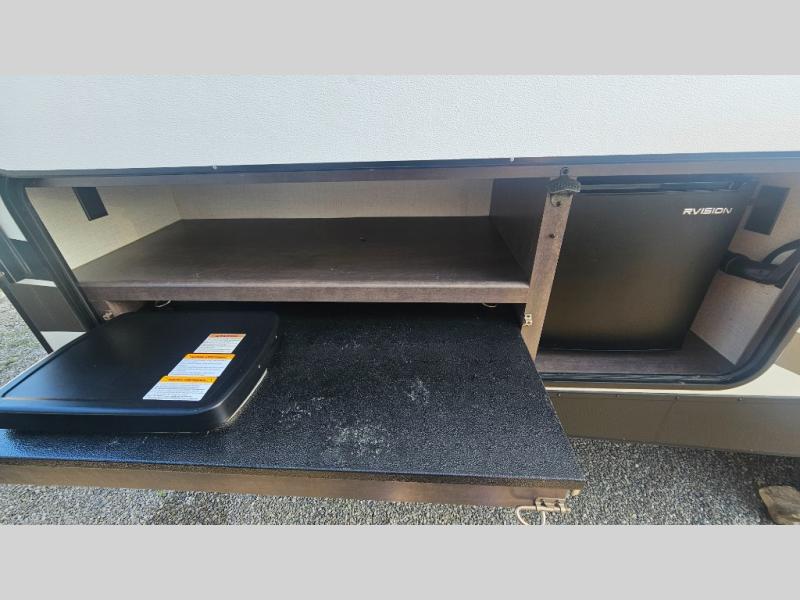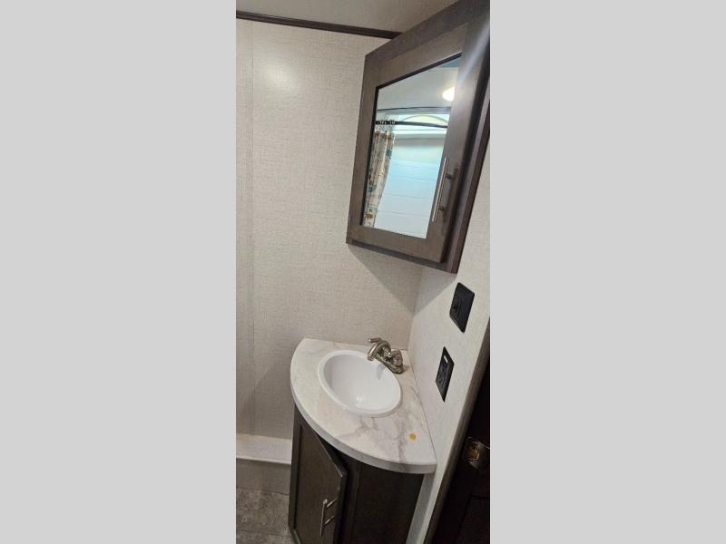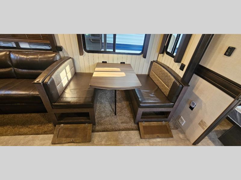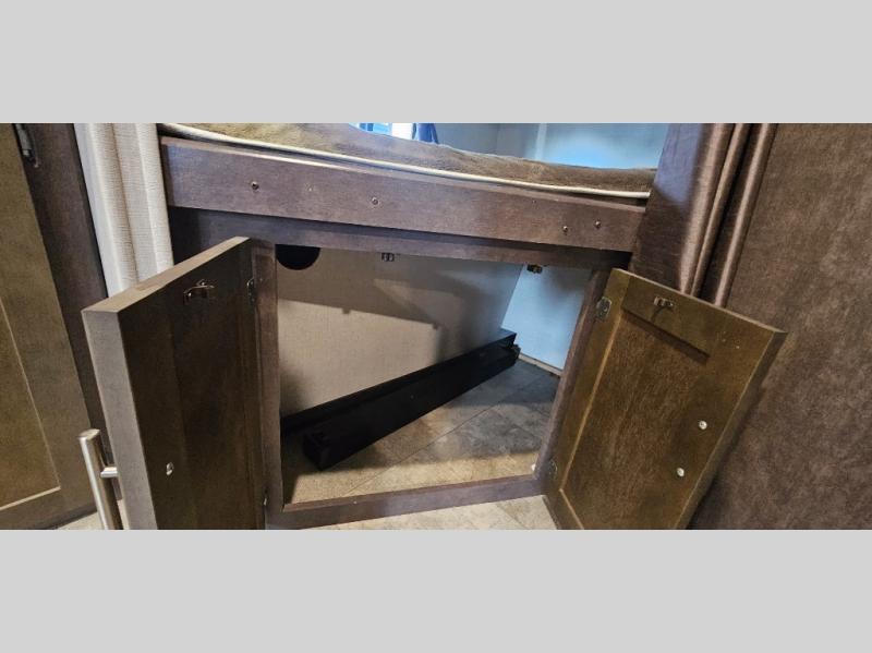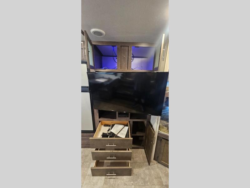 The exterior of this CrossRoads travel trailer is completely sleek and modern looking with its tinted windows that help protect your interior decor from fading and its painted fiberglass front cap that curves over to the roof giving this model a more aerodynamic approach. However, you will enjoy spending your evenings outside of this trailer for more reasons than just the appealing exterior vibe because this model comes equipped with an electric awning with LED lights, as well as outdoor speakers which make this area the perfect place to host a late-night get together with friends.