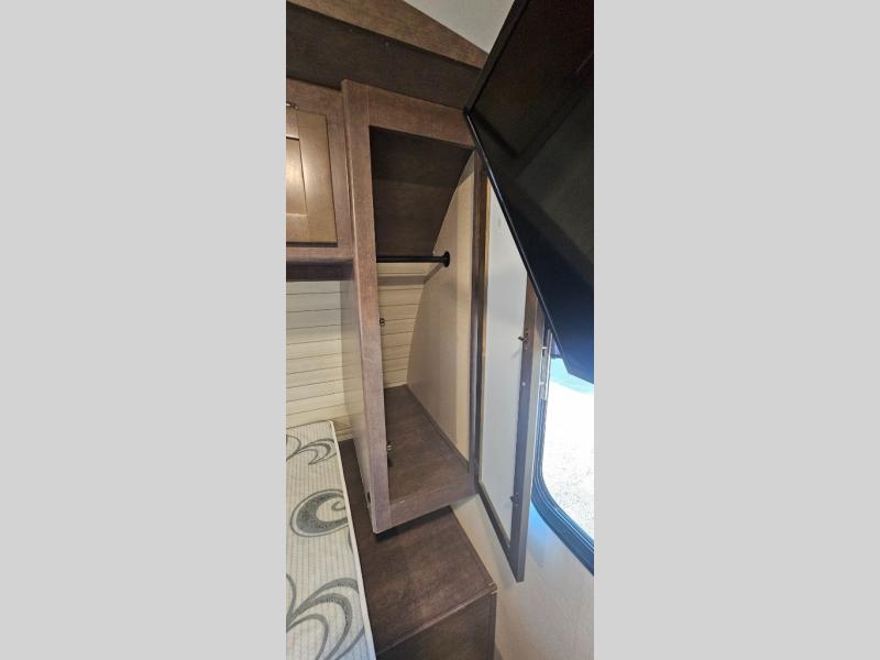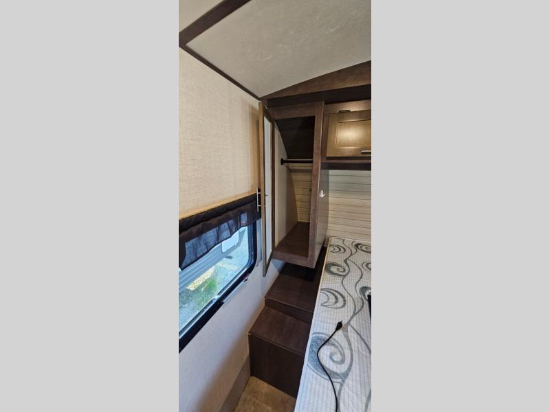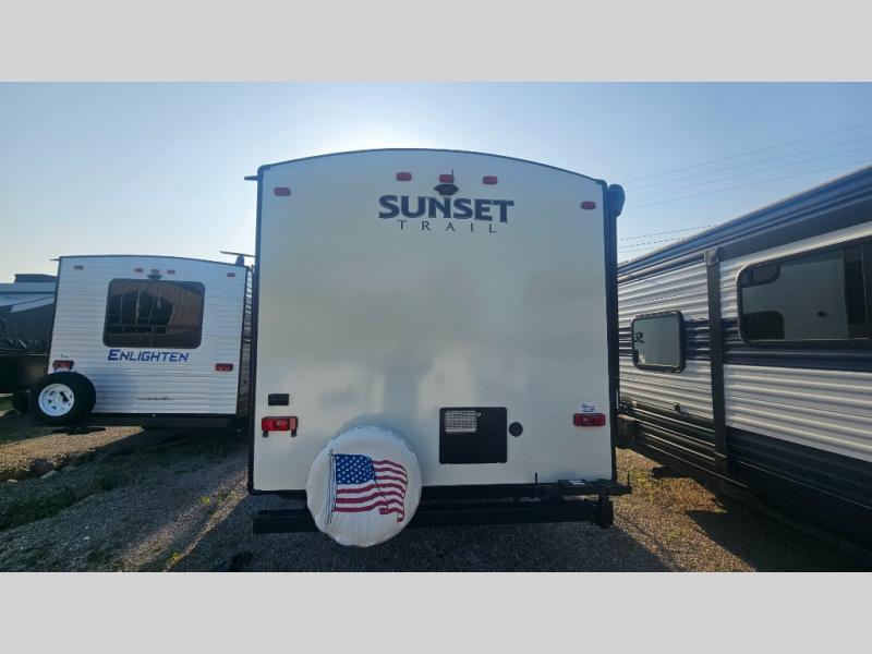 When you travel in this Sunset Trail Super Lite travel trailer, you will be traveling in comfortable style. With its ability to sleep nine people, this trailer is the perfect match for those who travel with larger families because of the front, private bedroom with a queen-size bed and the rear, private bunkhouse. This trailer even includes plenty of space to store all of the items that accompany nine people with a large bedroom wardrobe, a kitchen pantry, and an exterior pass-through storage space with motion-activated LED lights.