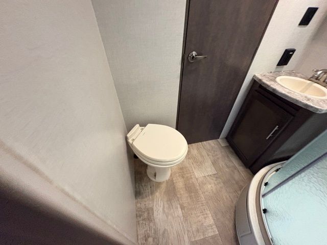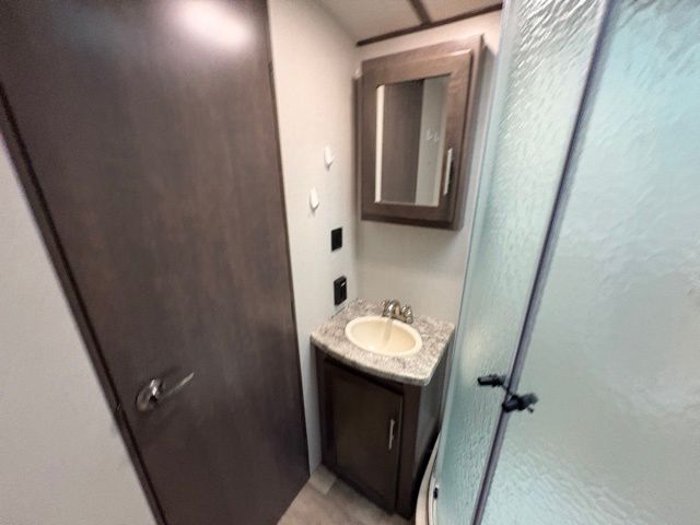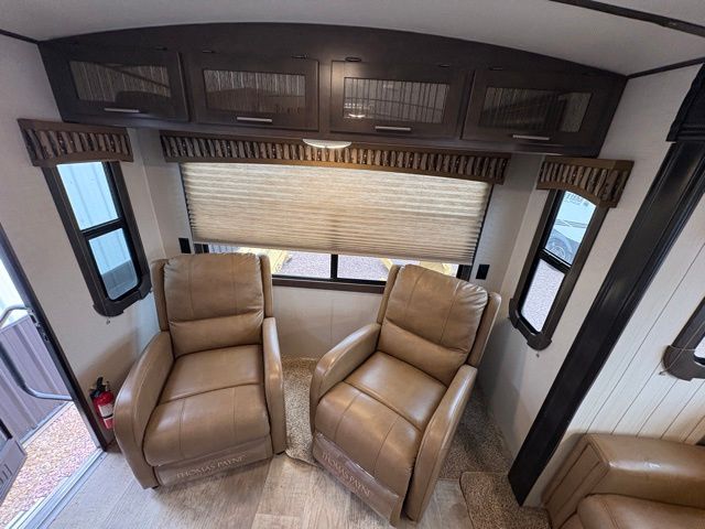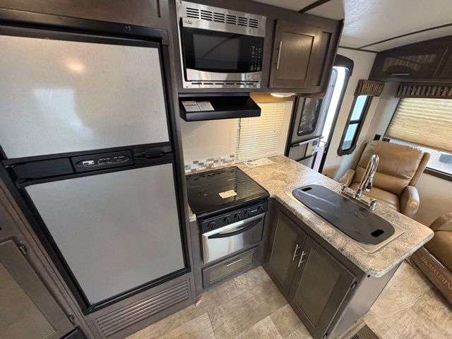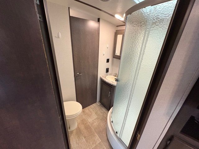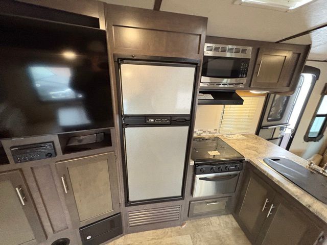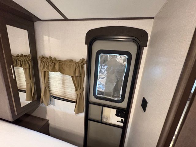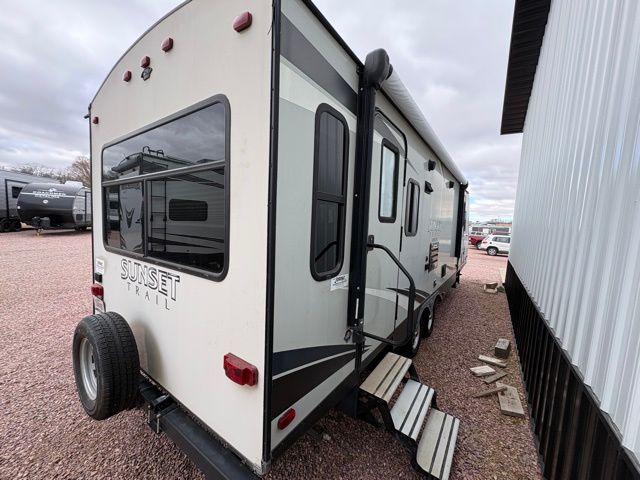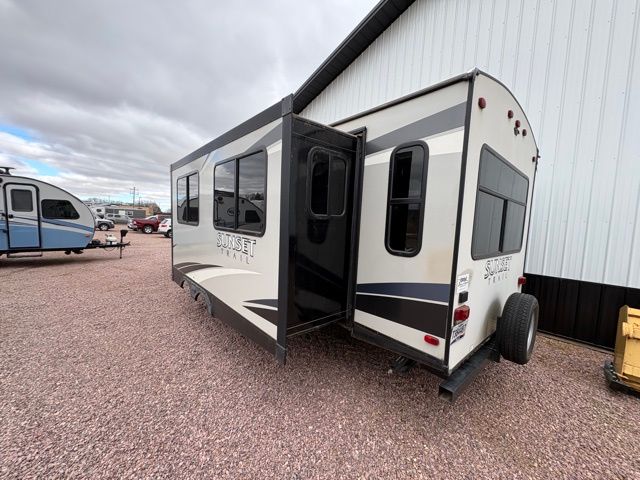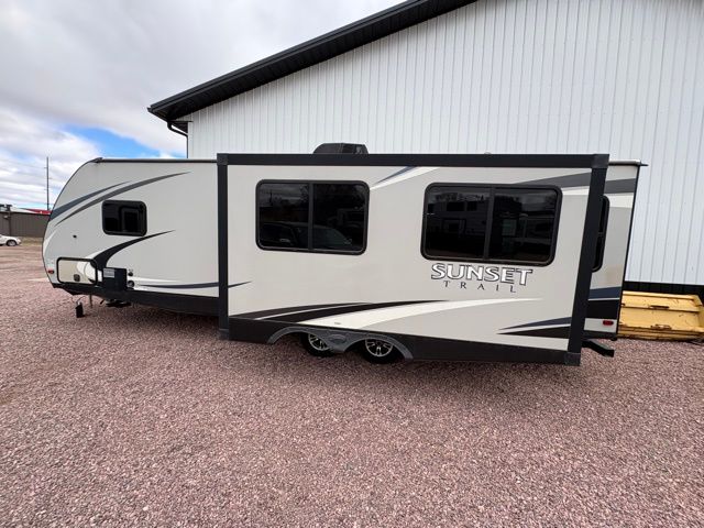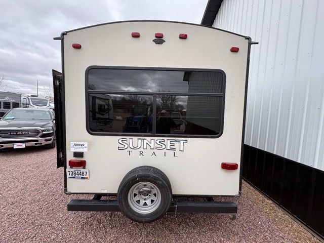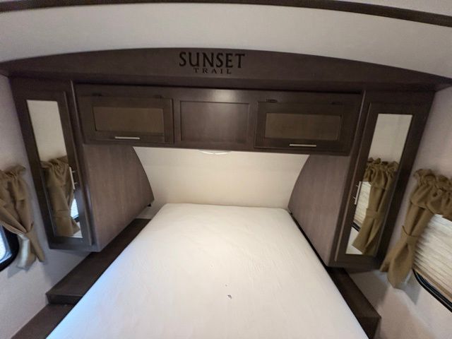 Because of its updated and comfortable style, this Sunset Trail Super Lite travel trailer is the perfect addition to your family's next road trip. With a large bedroom wardrobe and an exterior pass-through storage area with motion-activated LED lights, this trailer gives you the ability to bring along all of your luggage needs, and with enough room to sleep five people, it also gives you the ability to bring along all of your family. The front, private bedroom has been turned into a luxury escape because of its own bathroom and exterior entrances.
