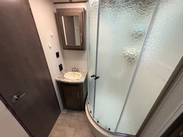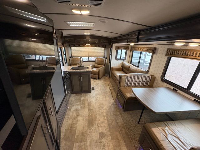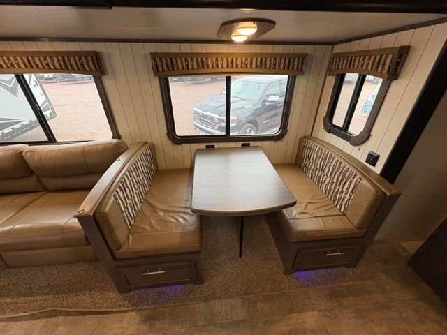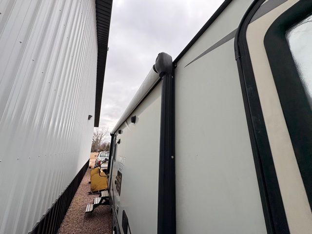 The exterior of this CrossRoads travel trailer is completely sleek and modern looking with its tinted windows that help protect your interior decor from fading and its painted fiberglass front cap that curves over to the roof giving this model a more aerodynamic approach. However, you will enjoy spending your evenings outside of this trailer for more reasons than just the appealing exterior vibe because this model comes equipped with an electric awning with LED lights, as well as outdoor speakers which make this area the perfect place to host a late-night get together with friends.