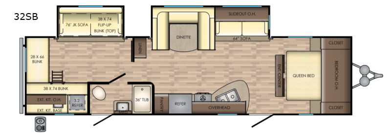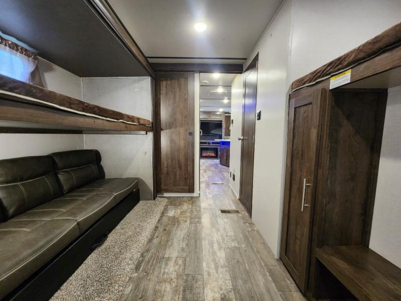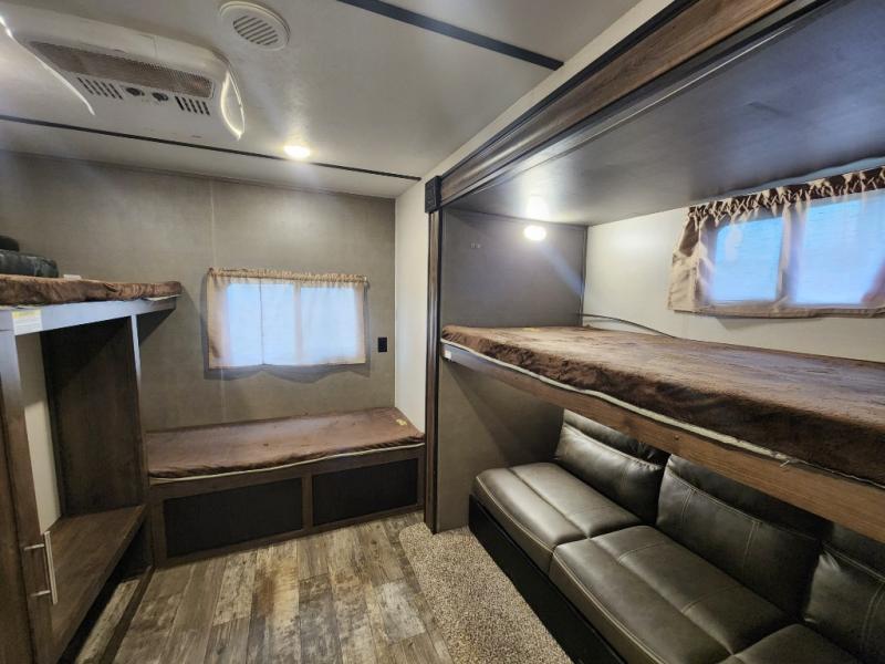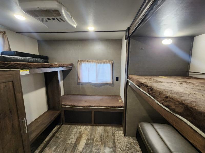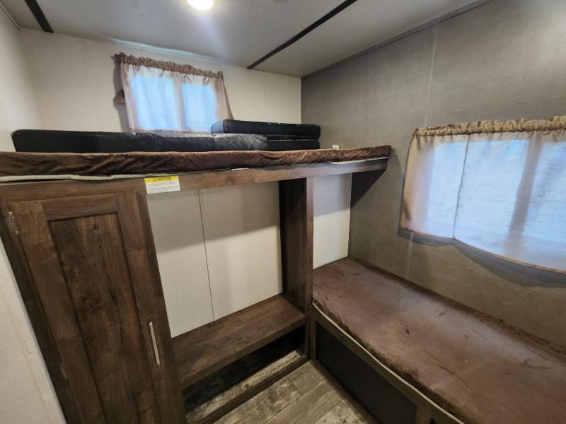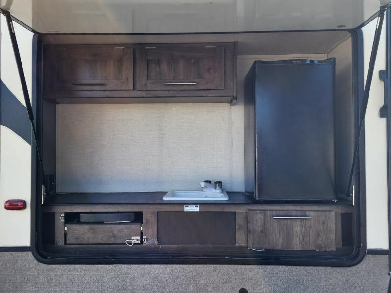 With sleeping space for up to nine people, you can bring along your family or a few friends on your next camping trip with this double slide out CrossRoads RV Volante 32SB travel trailer. In the rear you will find plenty of space with a bunkhouse which features a few bunks and a sofa. Not only does the bathroom have everything you need to get ready for the day, there is also an outside entry door, so now you don’t have to walk through the trailer just to get to the bathroom. In the combined kitchen and living area there is plenty of space with a roadside slide out. Outside enjoy the convenience of an outdoor kitchen which features a two burner range, sink, overhead cabinet, and a refrigerator, plus more!