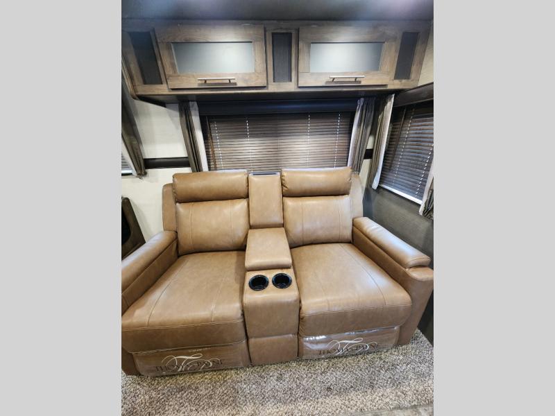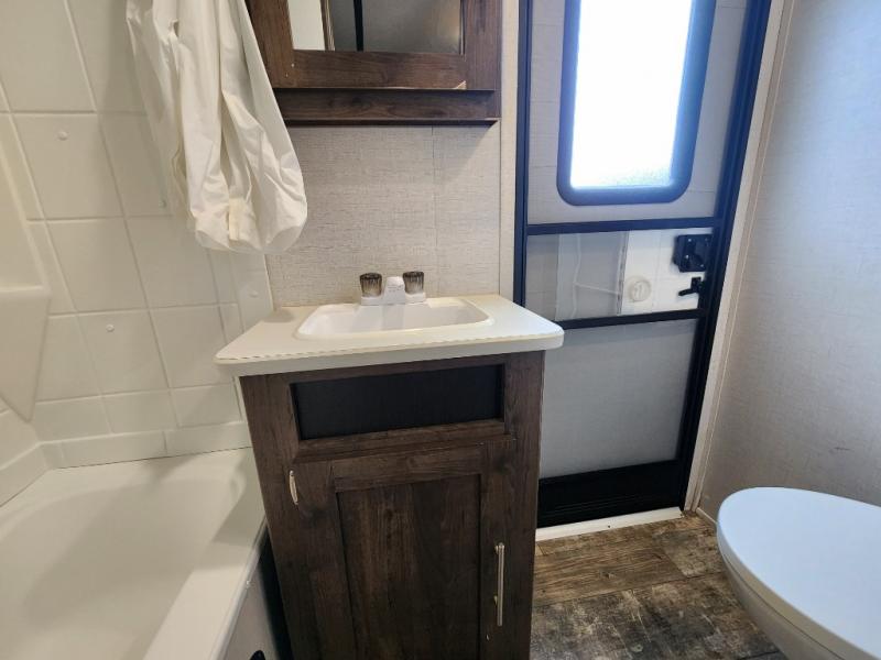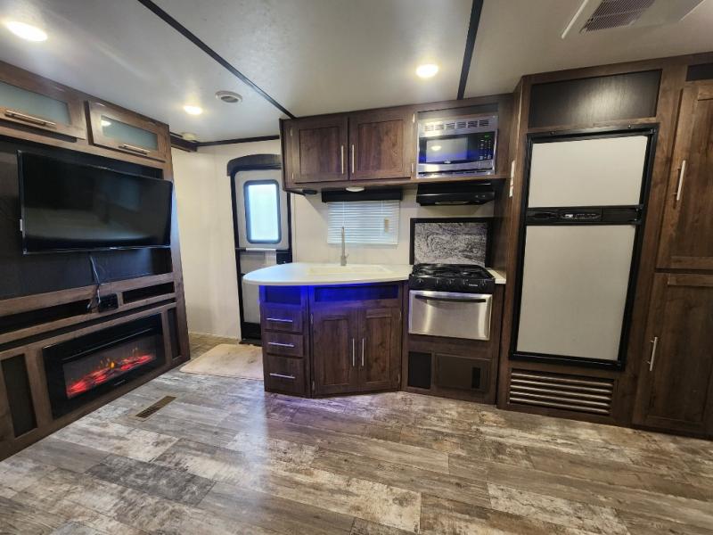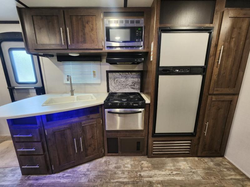 The CrossRoads RV Volante travel trailers are anything but ordinary! From the residential wood blinds in the living room, the premium residential furniture throughout, to the LED lights with LED accents lights in the slide outs you will be impressed from the minute you enter these fifth wheels. In each kitchen you will find stainless steel appliances such as an XL 50/50 sink, microwave, and oven. Along the exterior there is a fully enclosed and heated underbelly, an outside shower which makes it easy to clean up before heading inside, and tinted safety glass windows.