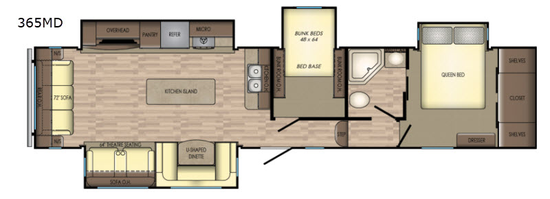 Come see just how fun and easy camping can be with your family when you choose to camp with this quad slide out Volante 365MD fifth wheel. In the living area you can do a little entertaining since there is a 72" sofa, 64" theater seating, and an entertainment center. The spacious kitchen area has a large island where you can easily work to prepare meals for your family. Your kids will enjoy the private bunk room which has a 48" x 64" bunk beds, and mom and dad will find a quiet retreat in the private front bedroom.