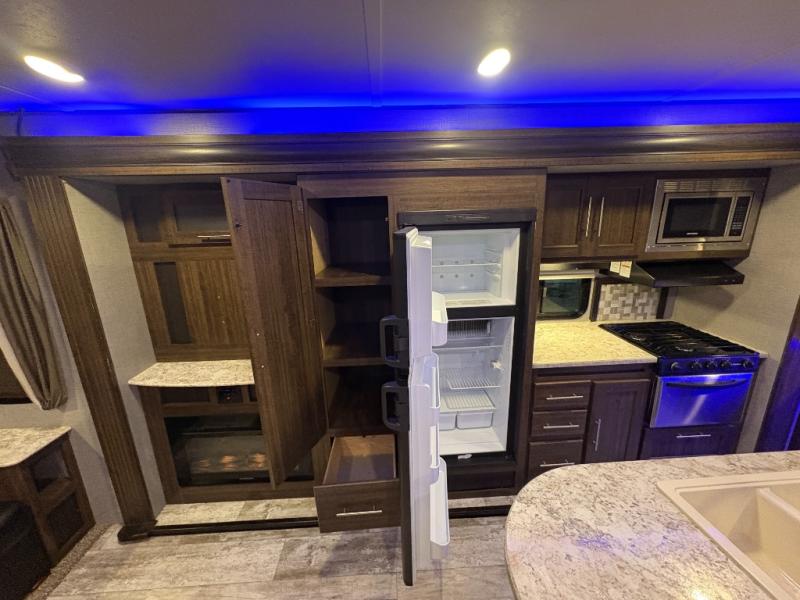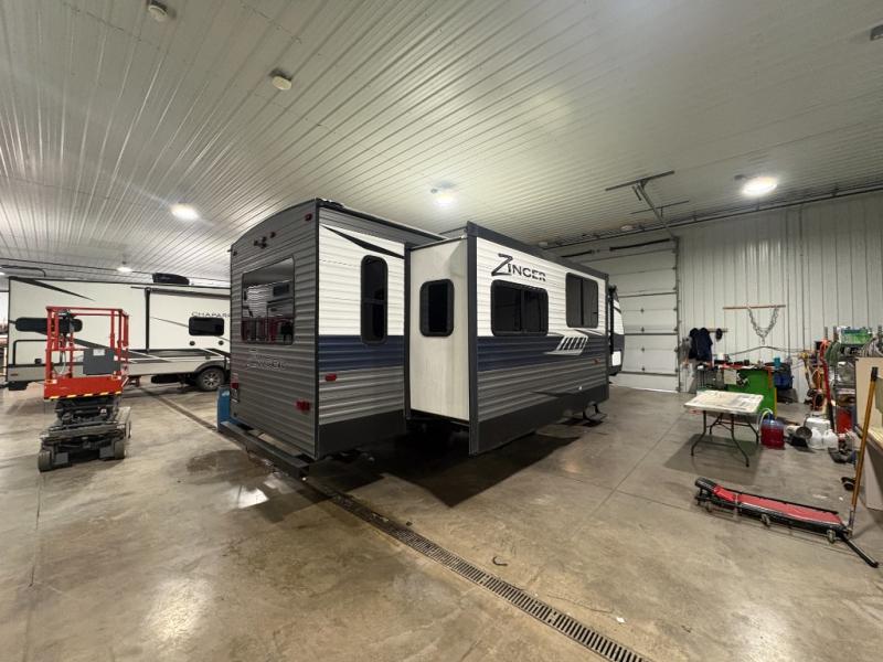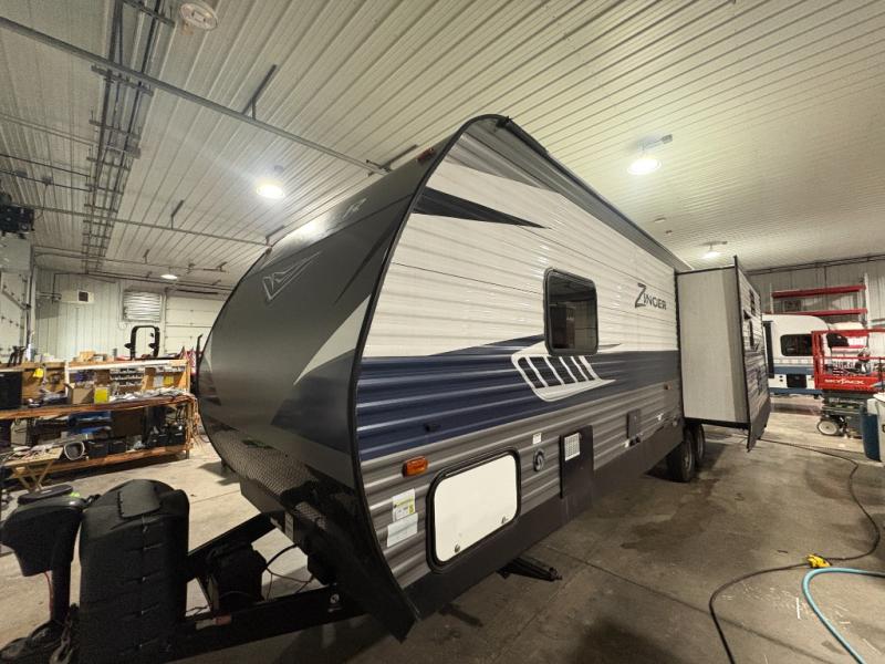 When you are looking to set your sights to new destinations then come choose this Zinger ZR292RE travel trailer! With dual opposing slide outs you will find plenty of floor space in the combined kitchen/living area. Meal prep and clean up is a breeze with the island which also features a double sink. Within the slideout along the curbside there is a 41" x 77" u-dinette which can double as a sleeping spot at night. In the evening come relax at the recliners while watching a little TV at the entertainment center.