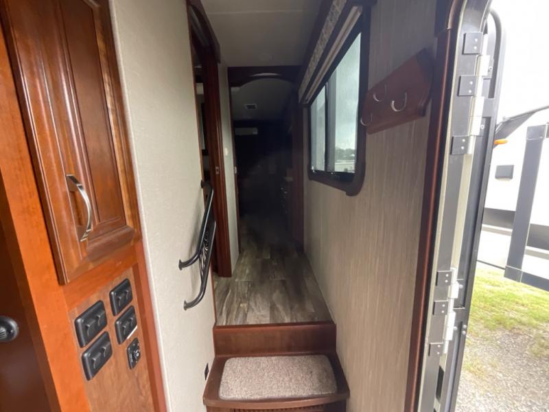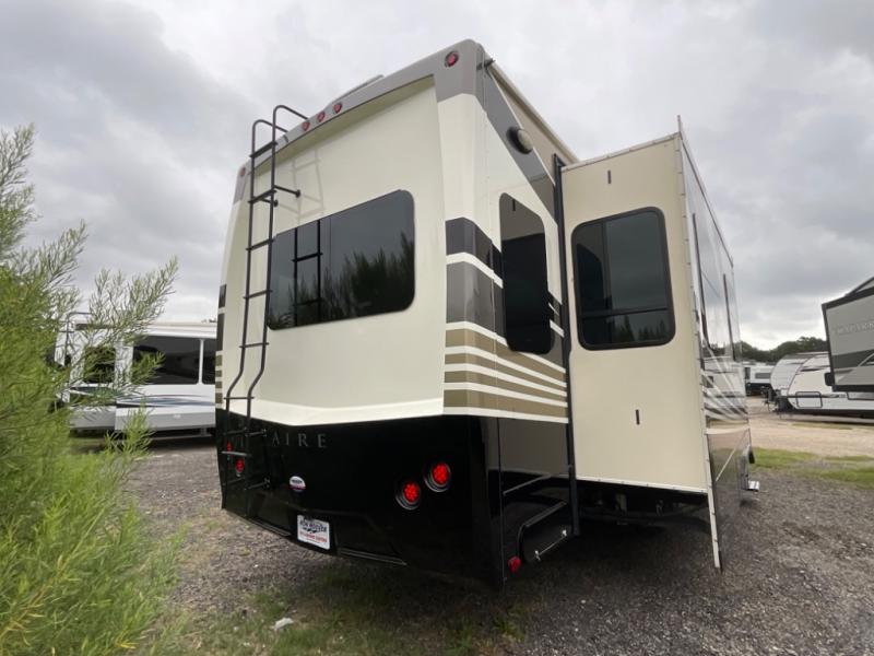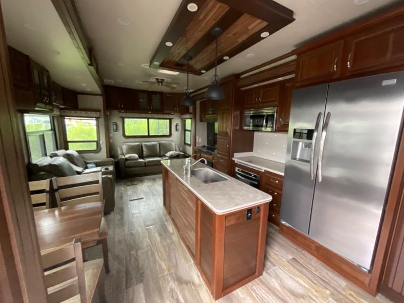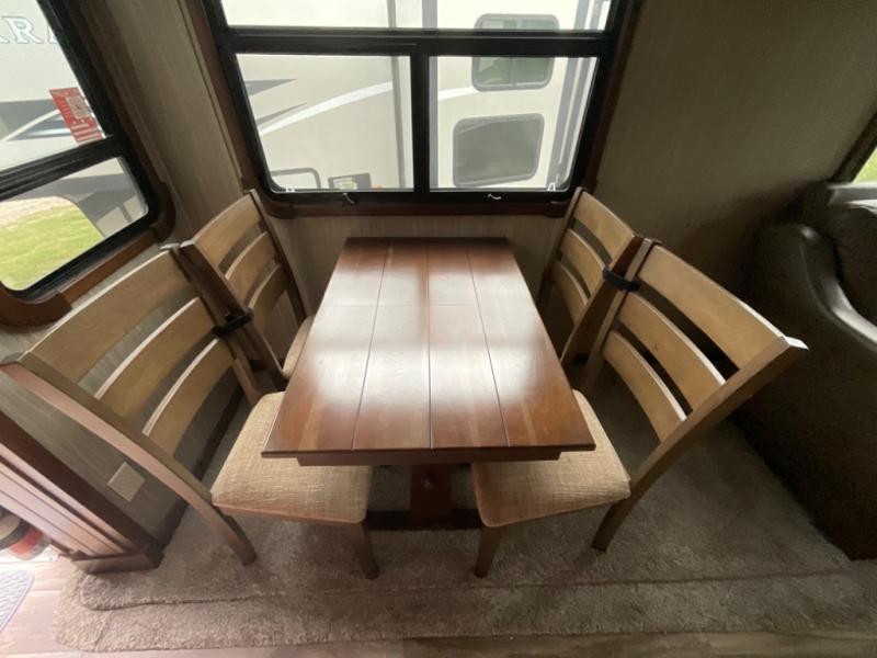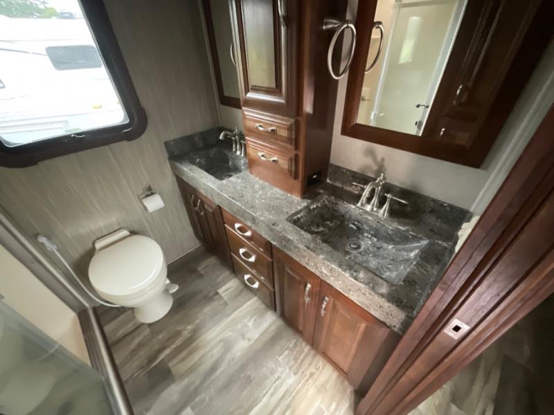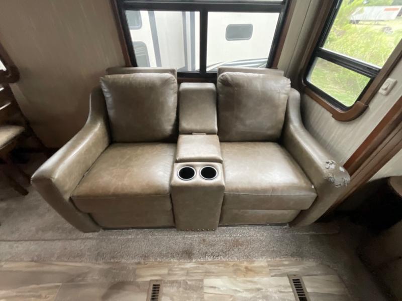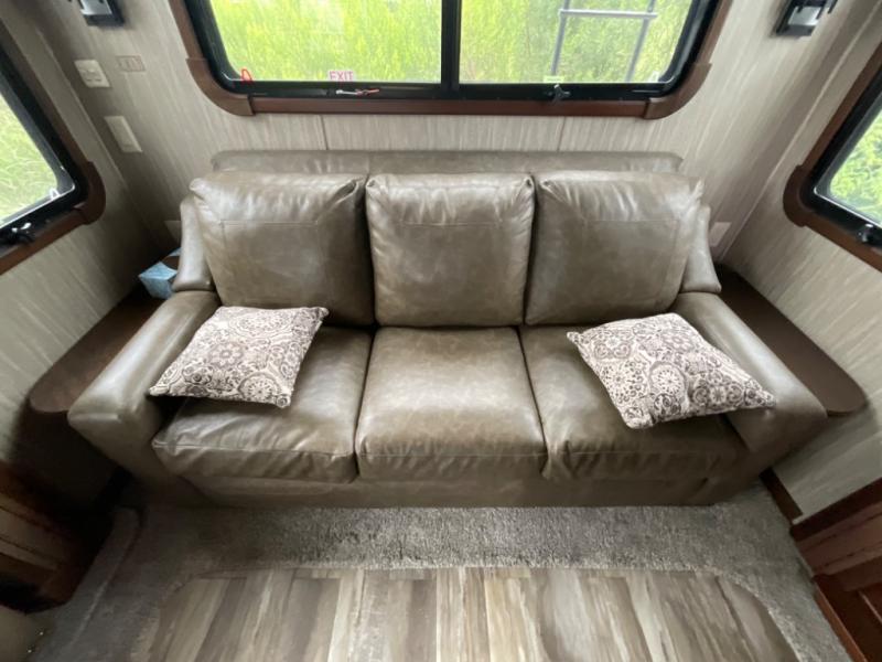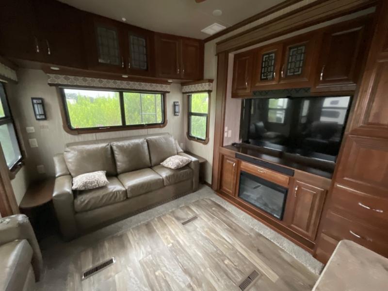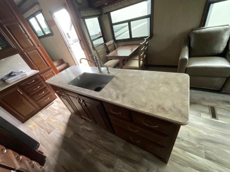 For a luxury fifth wheel you will want to camp with a Mobile Suites Aire. These models feature an enclosed underbelly so you can camp in cooler weather. Inside you will find hand laid vinyl plank tile flooring, solid surface counter tops with a lighted island edge, and an electric fireplace with a remote control. There are plenty of residential features throughout from the residential high durability carpet to the residential sofa with a hide-a-bed and the theater seating with center console. What are you waiting for? Come choose your luxury fifth wheel today!
