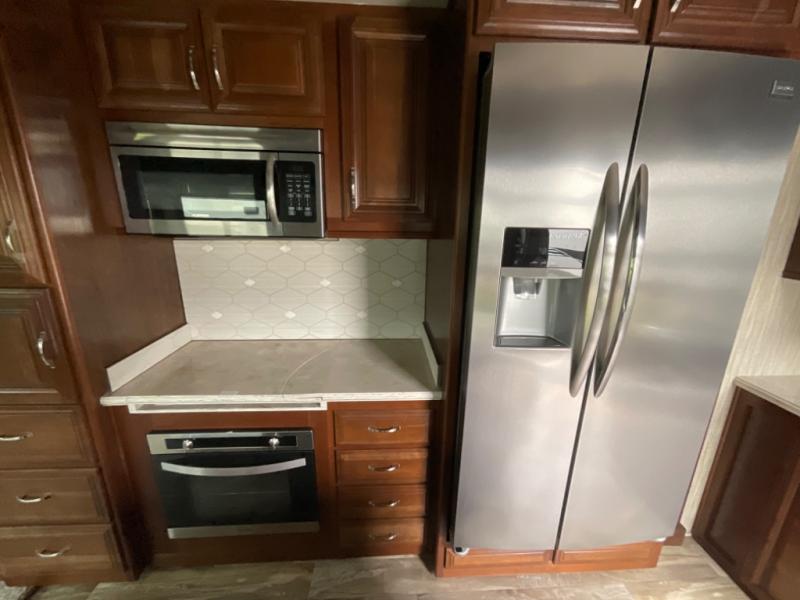 This DRV Luxury Suites Mobile Suites Aire fifth wheel model MSA 38 has quad slide outs for added interior space, and plenty of at-home residential touches to make this a perfect vacation home! In the kitchen you can easily prepare your meals and clean up at the island. You will find that there is a free-standing table and four chairs where you can eat your meals or play a card game after dinner. Come relax in the living area at the theater seats while watching TV at the 55" TV plus there is a fireplace for those chilly evenings! The bathroom features her/her sinks plus a 30" x 42" shower and more!