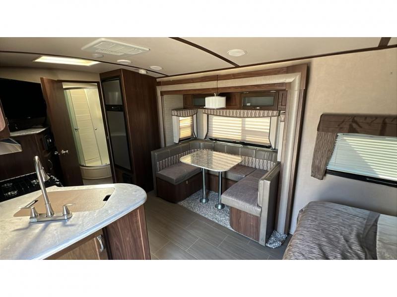 The 44" x 74" u-shaped dinette with overhead storage is in the trailer's slide out with a large refrigerator beside it. On the opposite wall, you will find the kitchen area that features an angled double sink, and a three burner range with overhead microwave and cabinets. A corner pantry area with a TV mount above allows plenty of space for dry goods and inside time with the optional TV.