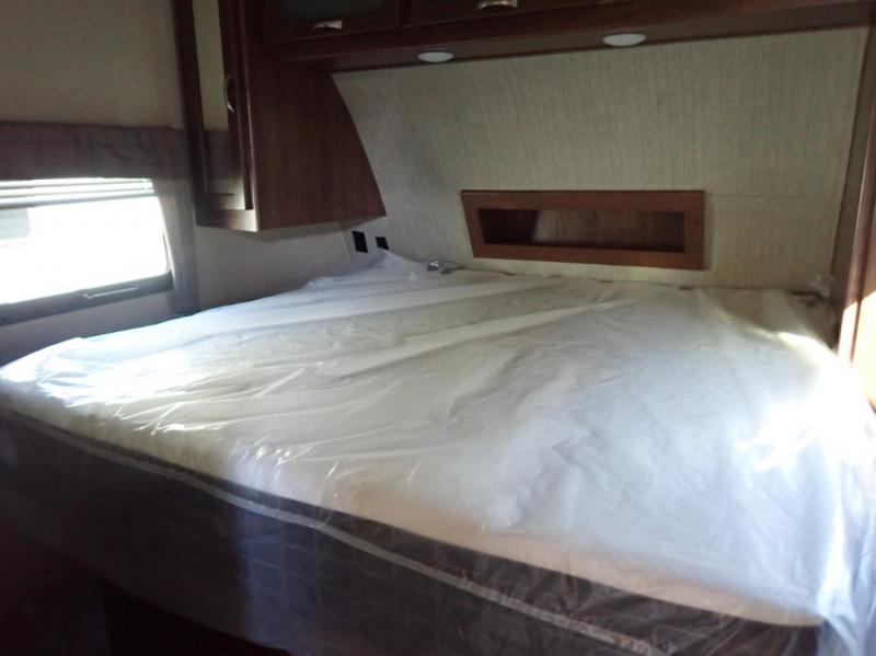 At the front, a private bedroom includes a king size bed with a wardrobe on each side and overhead cabinets above the head of the bed. There is an additional wardrobe in the corner opposite the bed.