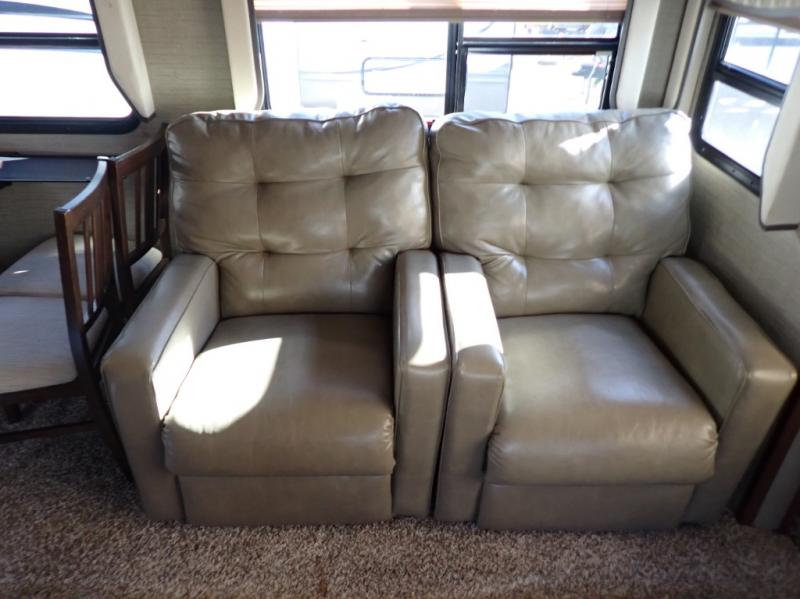 The living space features the entertainment center, a 40" TV, and overhead cabinets along the full rear wall of the trailer. A generous slide along the curbside wall provides two swivel rockers with overhead cabinets, and a free standing dinette with four chairs.