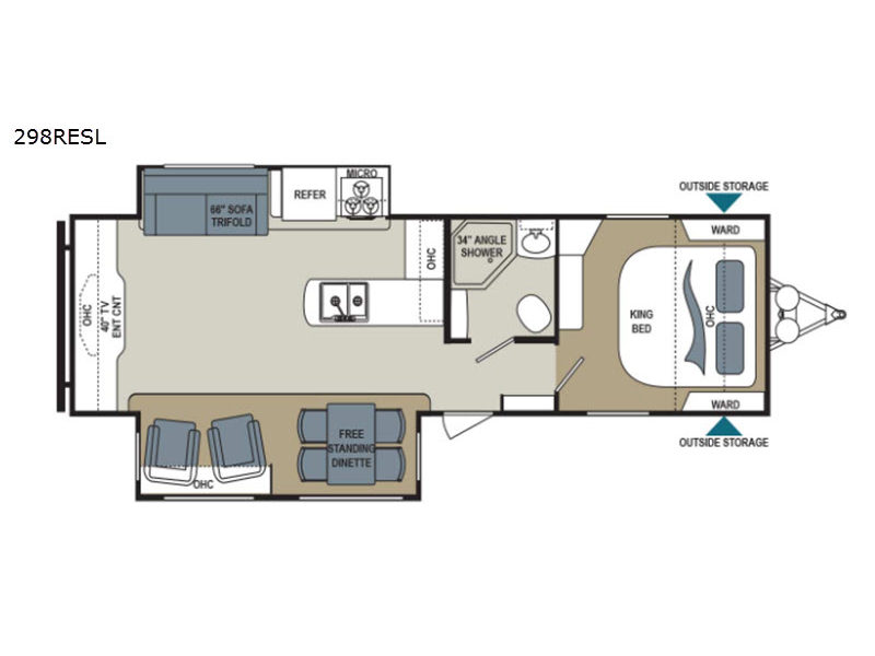 As you enter this travel trailer, a side aisle bathroom is directly in front of you. It includes an angled shower, linen storage, a vanity sink with medicine cabinet, and a toilet.