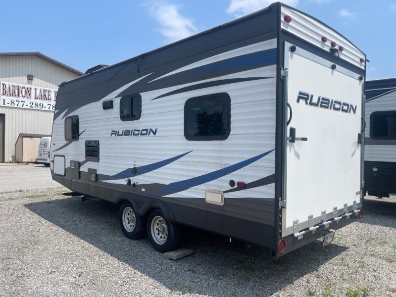 The Rubicon XLT Toy Hauler is designed to make any adventure extraordinary. It’s easily towable by most half-ton pickup trucks, and features upgraded graphics, a back-up camera, solar prep, a power tongue jack, and a generator rack for added convenience. With a 8' 6" wide body design, you’ll have ample living space, and plenty of cargo space to haul all your gear. If you need more room, more friends, and more toys for your next outdoor adventure, the Rubicon XLT is the perfect choice.